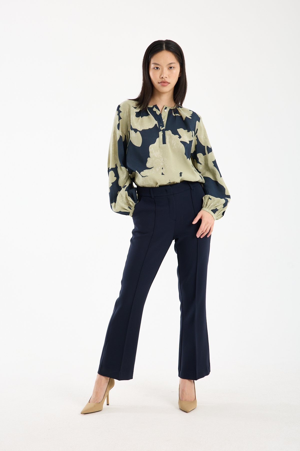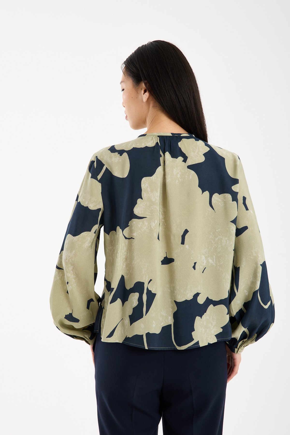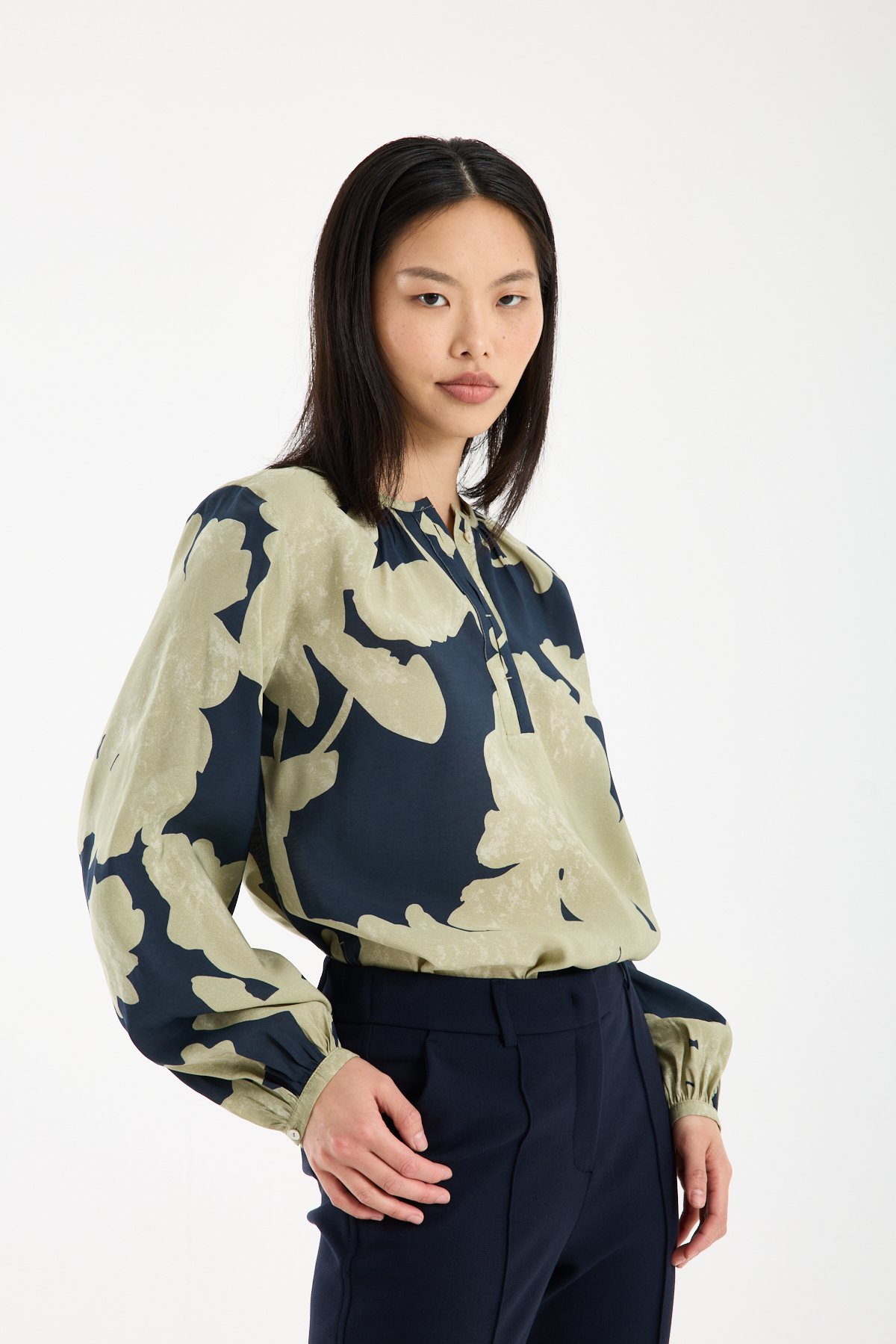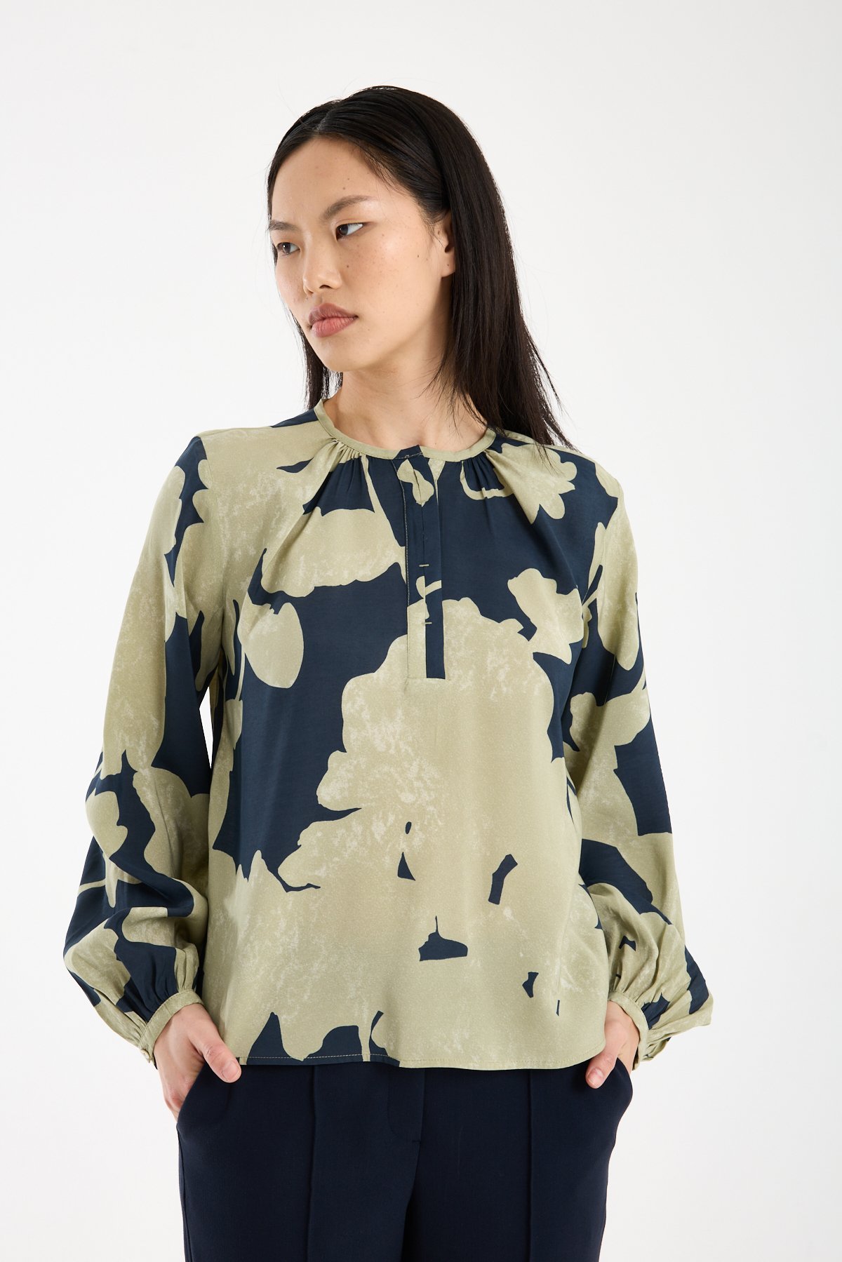 Yaka çevresindeki ince büzgü detayı, modele feminen ve rafine bir hareket kazandırır. Hakim yaka formu ve ön kısmındaki kısa düğme patı tasarımı modern bir çizgi oluştururken, büyük ölçekli soyut çiçek deseni güçlü ve sofistike bir stil sunar. Desenli modal bluz arayanlar için hem iddialı hem dengeli bir alternatiftir.