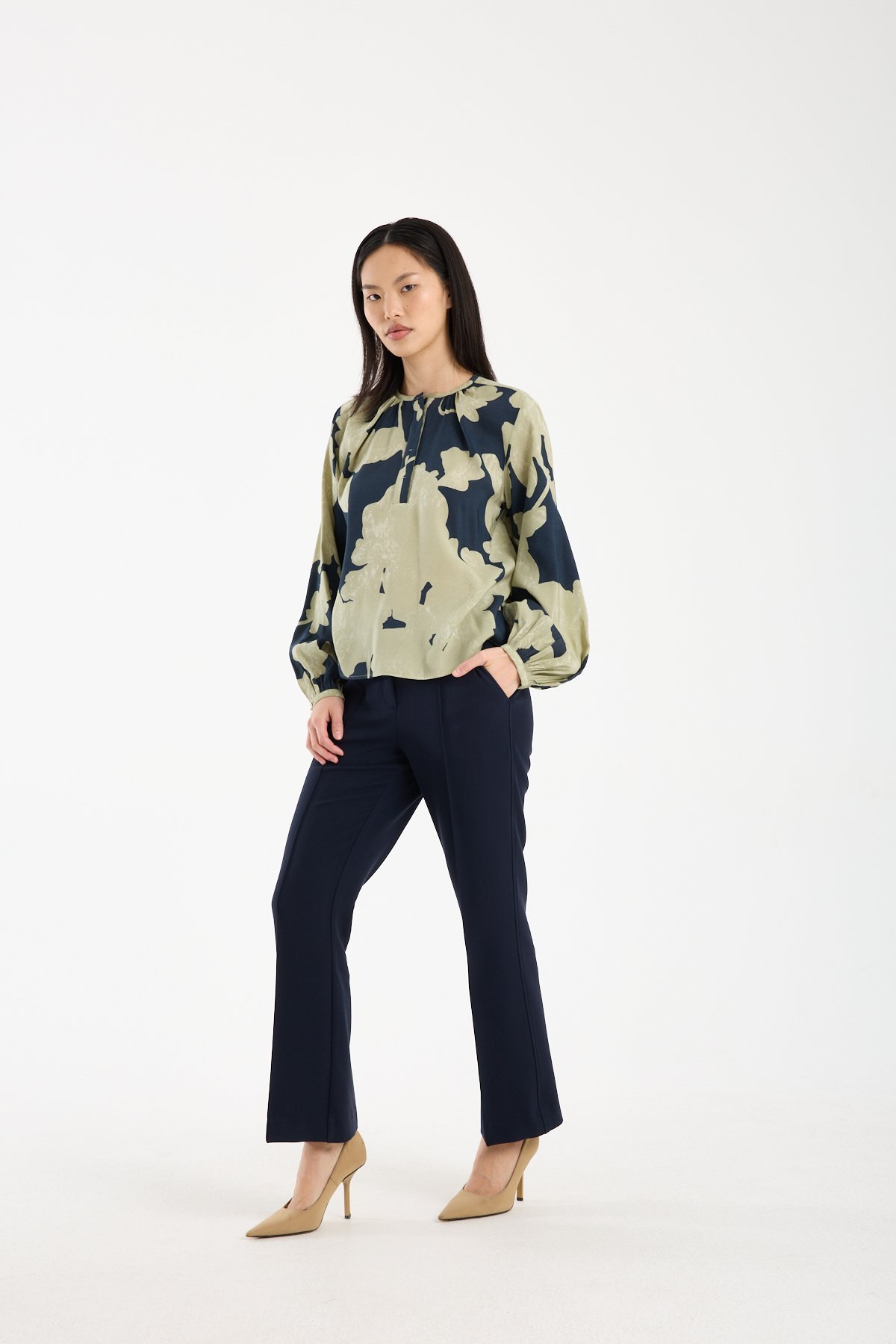 Uzun kollu ve rahat kesimi sayesinde hem ofis kombinlerinde hem günlük kullanımda konforlu bir tercih sunar. Akışkan yapısı sayesinde kumaş pantolon, klasik kesim pantolon veya eteklerle kusursuz uyum sağlar; sade alt parçalarla kombinlendiğinde stilin odak noktası haline gelir.