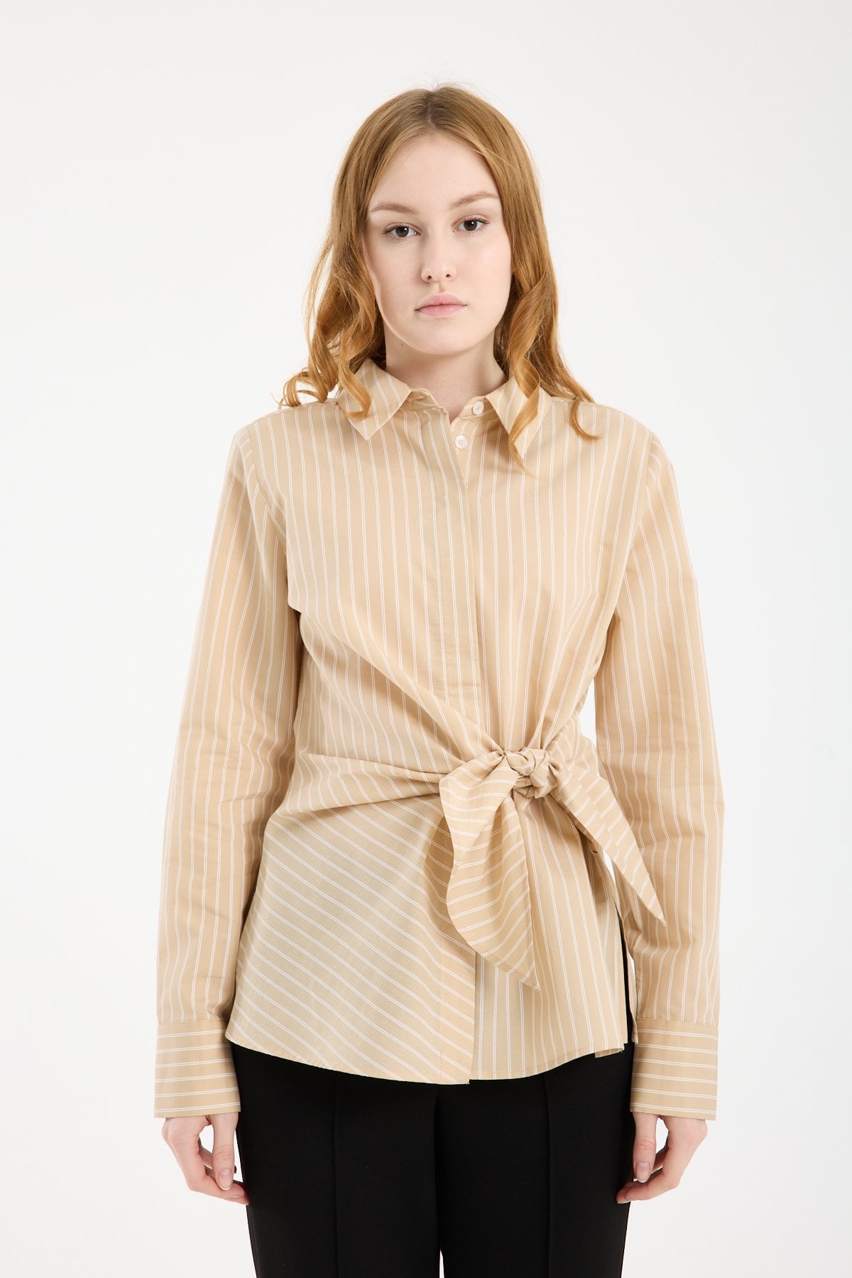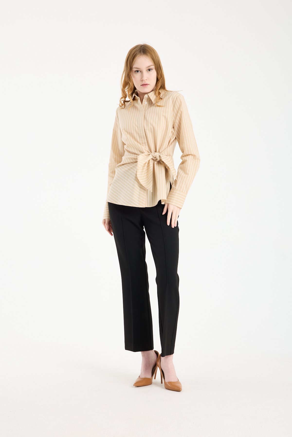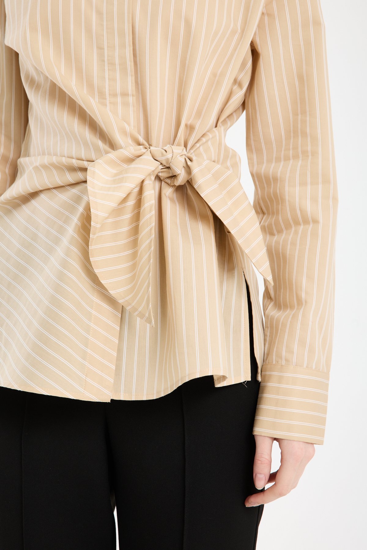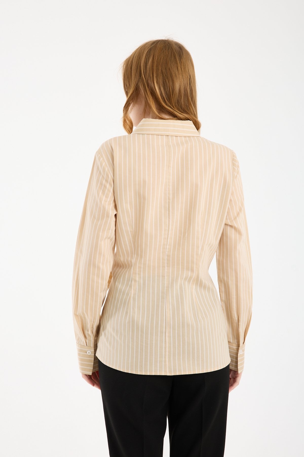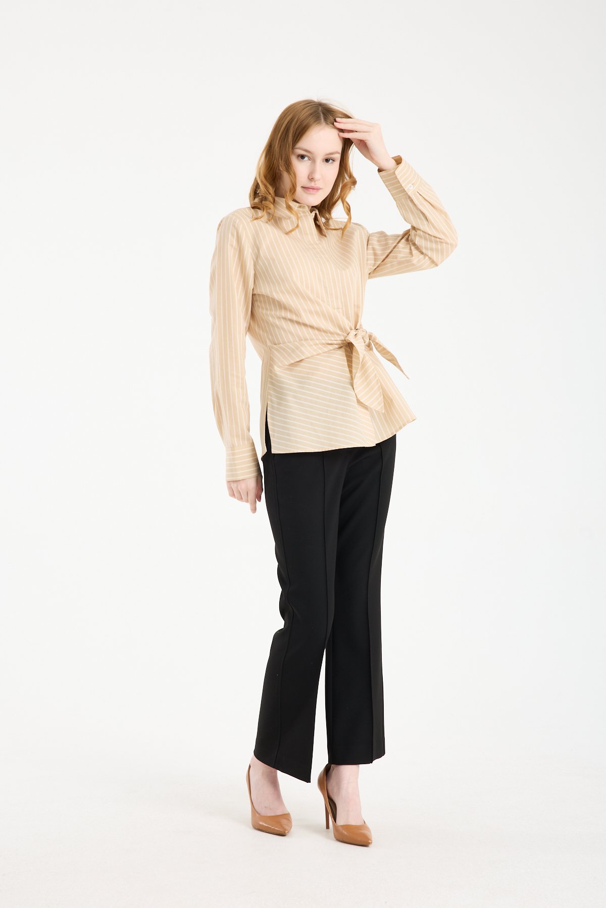 Kadın Bağlama Detaylı Çizgili Gömlek BEJ - 42