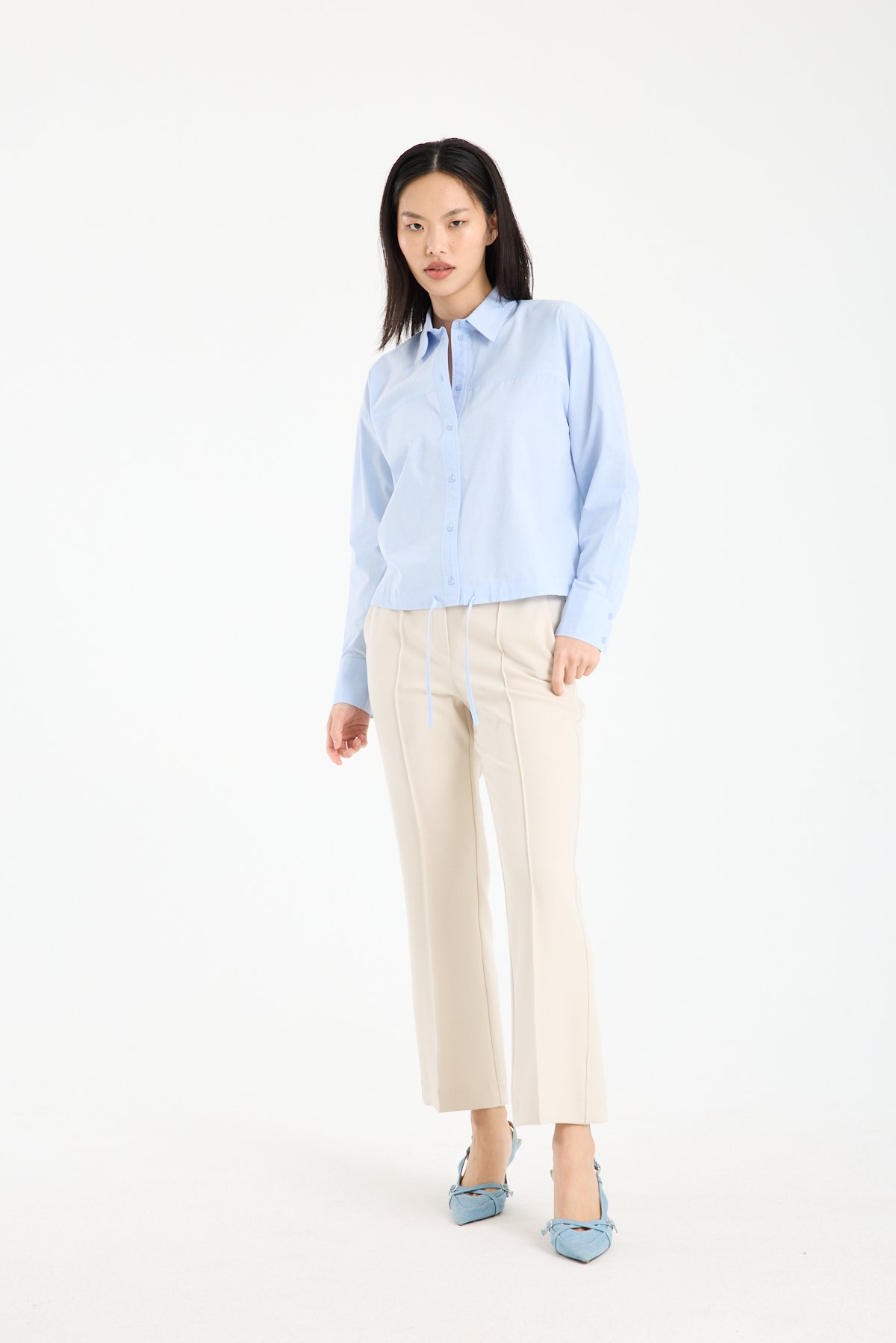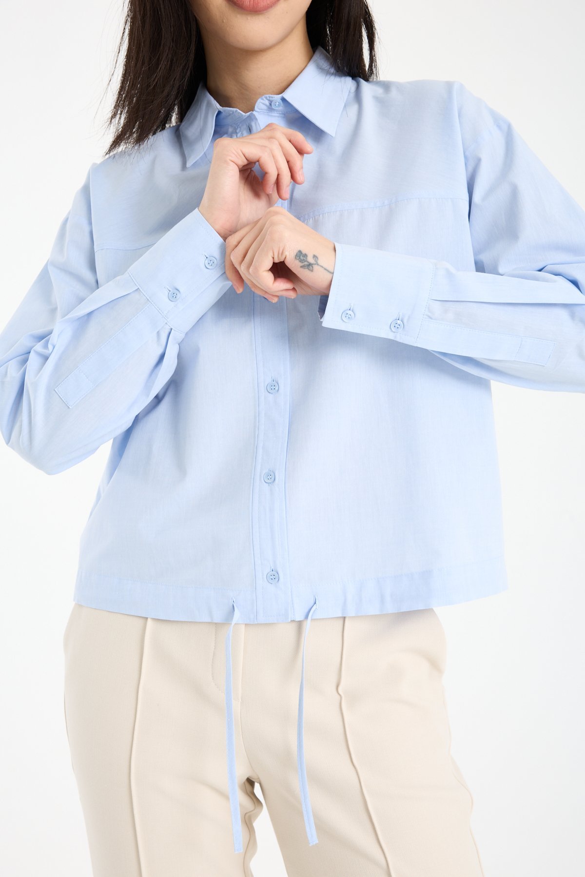 Gömlek yaka ve önden düğmeli tasarımı zamansız bir görünüm oluşturur. Alt kısmında yer alan ayarlanabilir bağcıklı büzgü detayı, ürüne dinamik bir hava katar. Bel kısmı istenilen ölçüde sıkılarak daha form kazandırılmış ve kısa bir siluet elde edilebilir. Bu detay, modeli klasik gömleklerden ayıran en güçlü tasarım unsurudur.