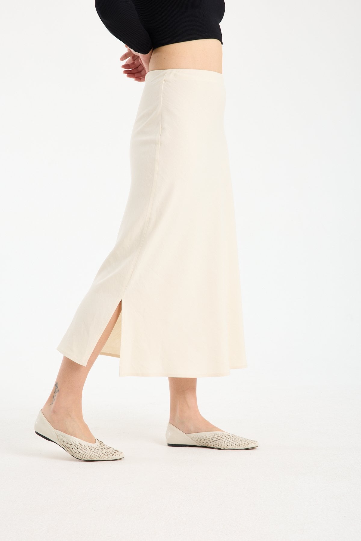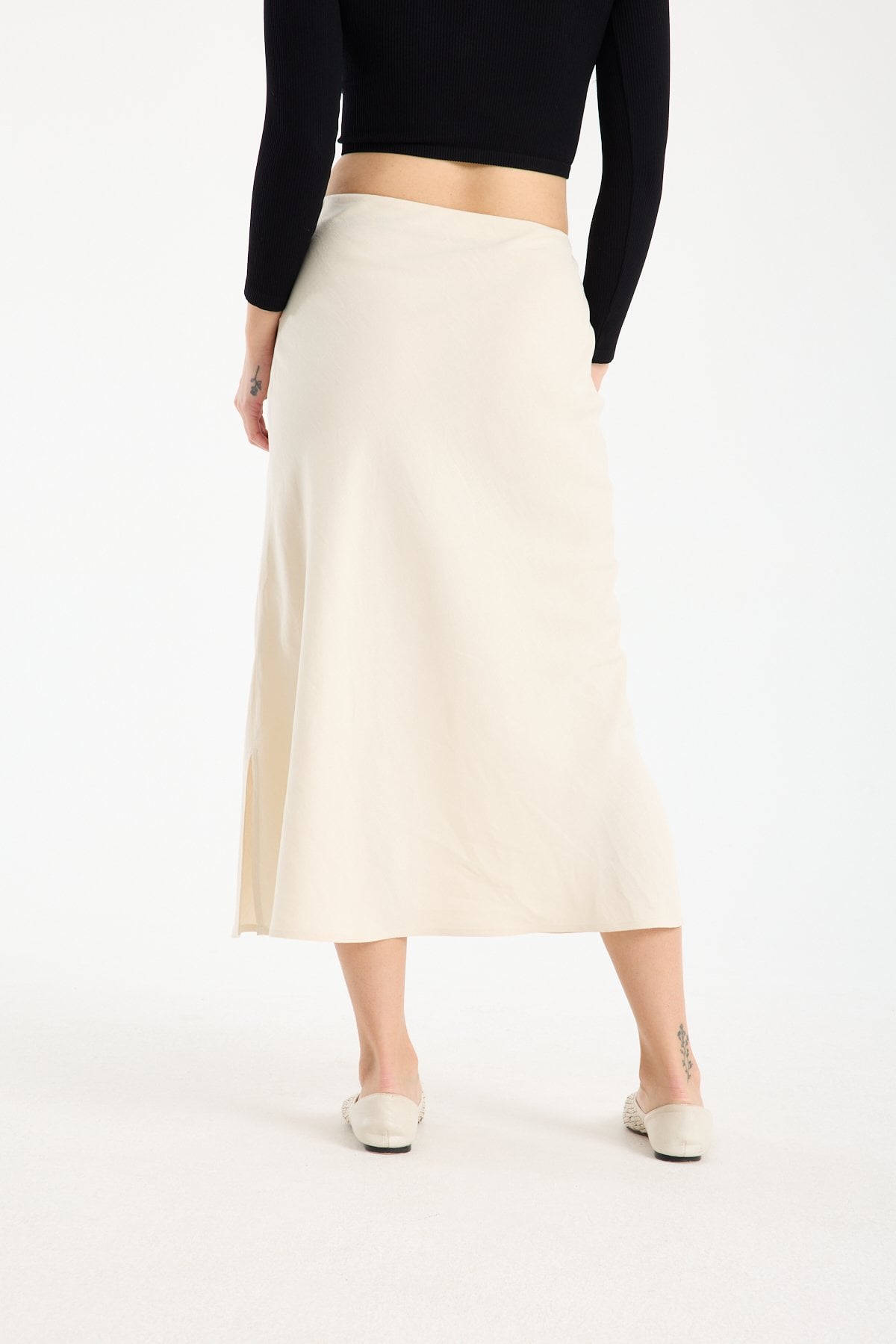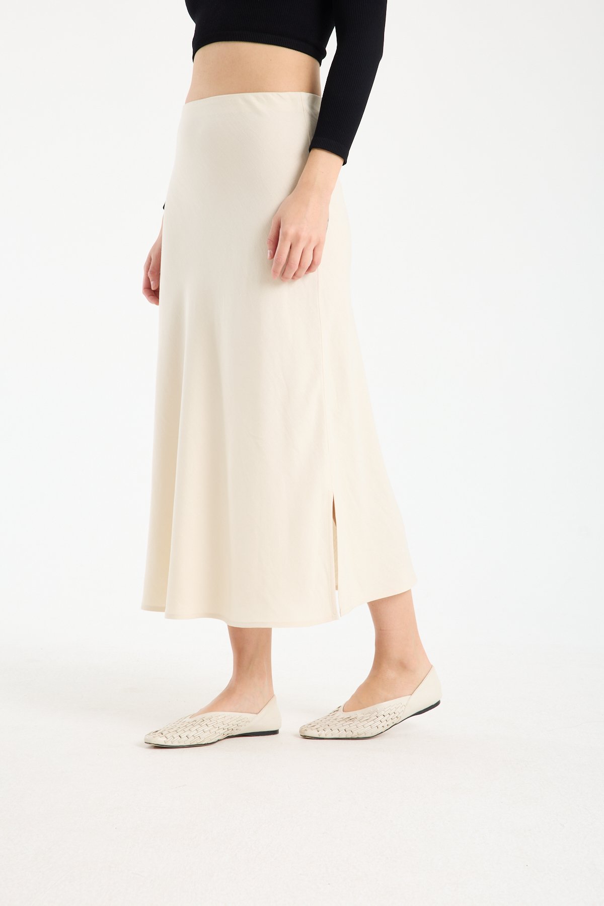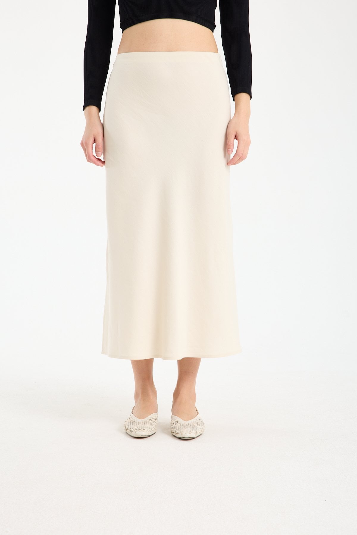 Kadın Beli Lastikli Dökümlü Yazlık Midi Keten Etek BEJ - 42