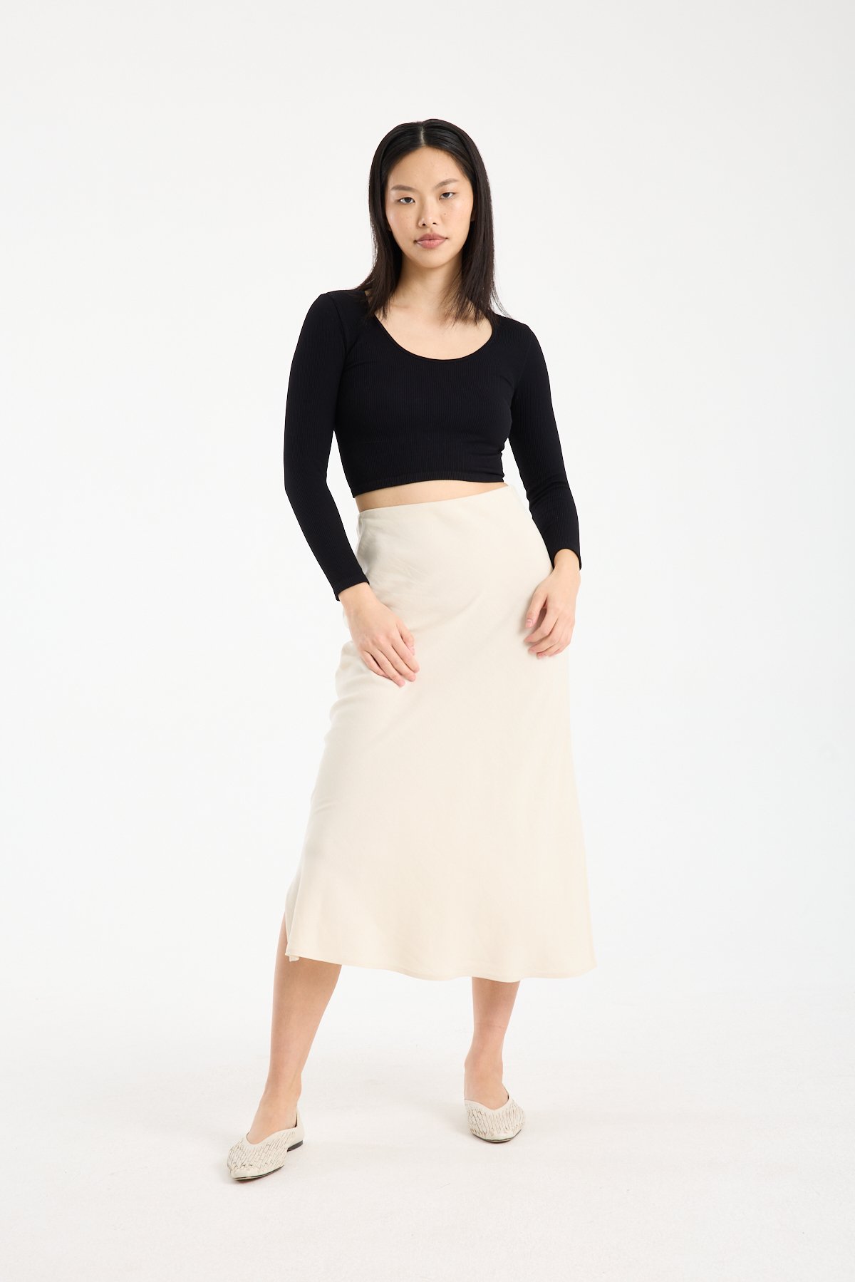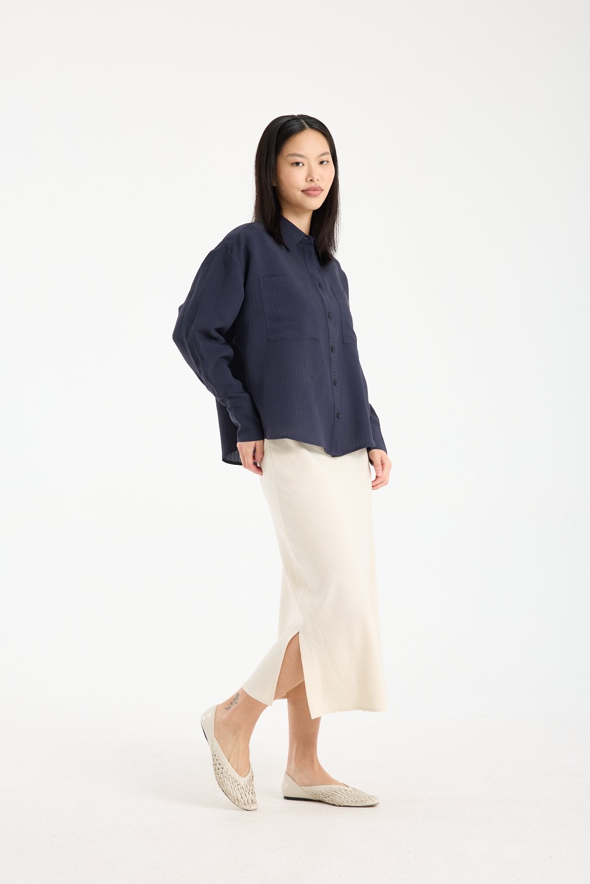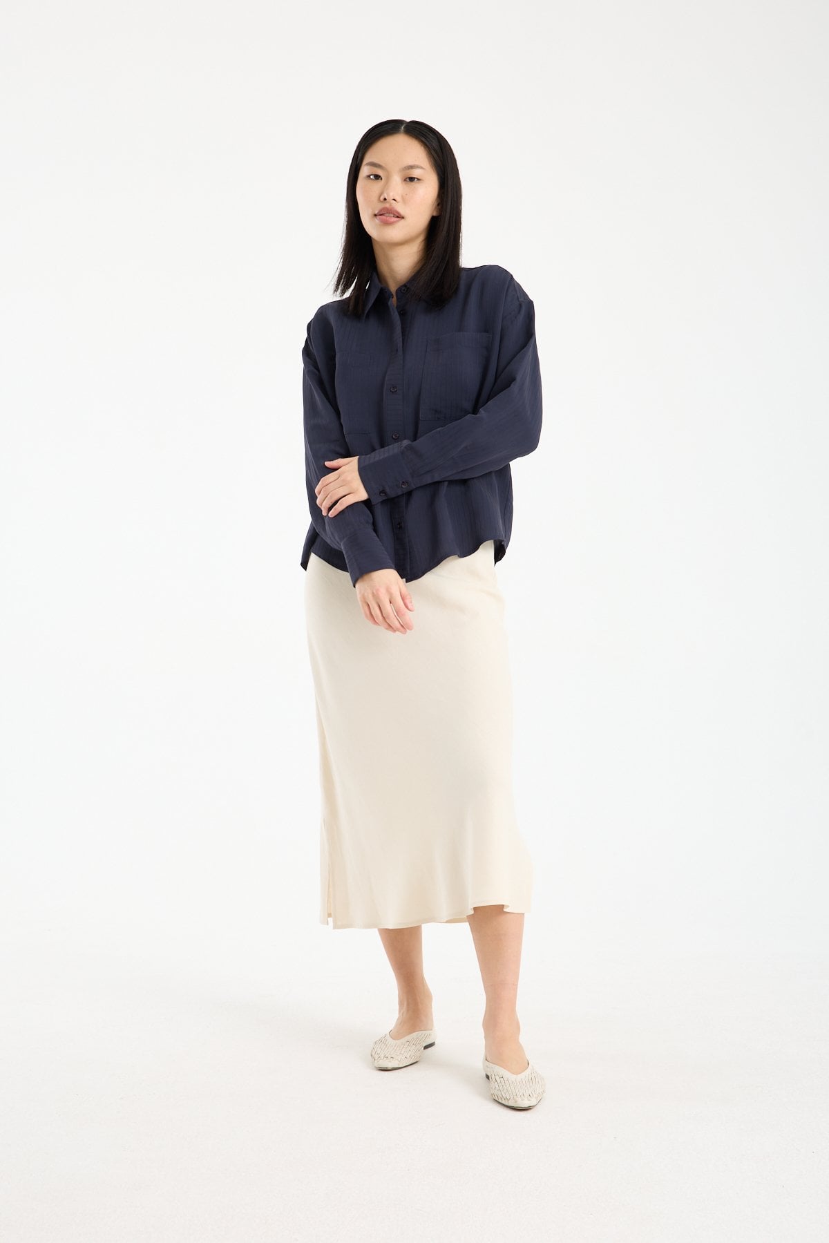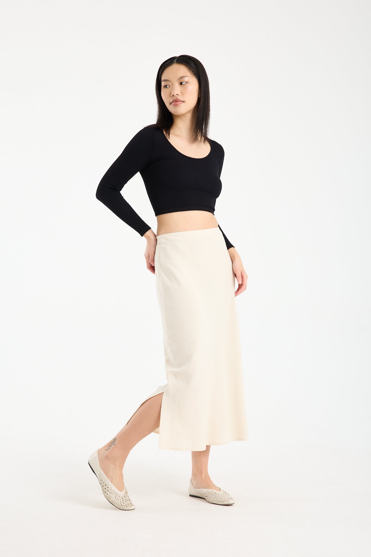 Doğal dokusu ve zamansız formuyla öne çıkan bu keten karışımlı midi etek, %71 viskon %29 keten kumaş içeriği sayesinde hafif, nefes alabilen ve konforlu bir kullanım sunar. Viskonun akıcı yapısı eteğe zarif bir dökümlülük kazandırırken, keten içeriği doğal ve sofistike bir görünüm sağlar.