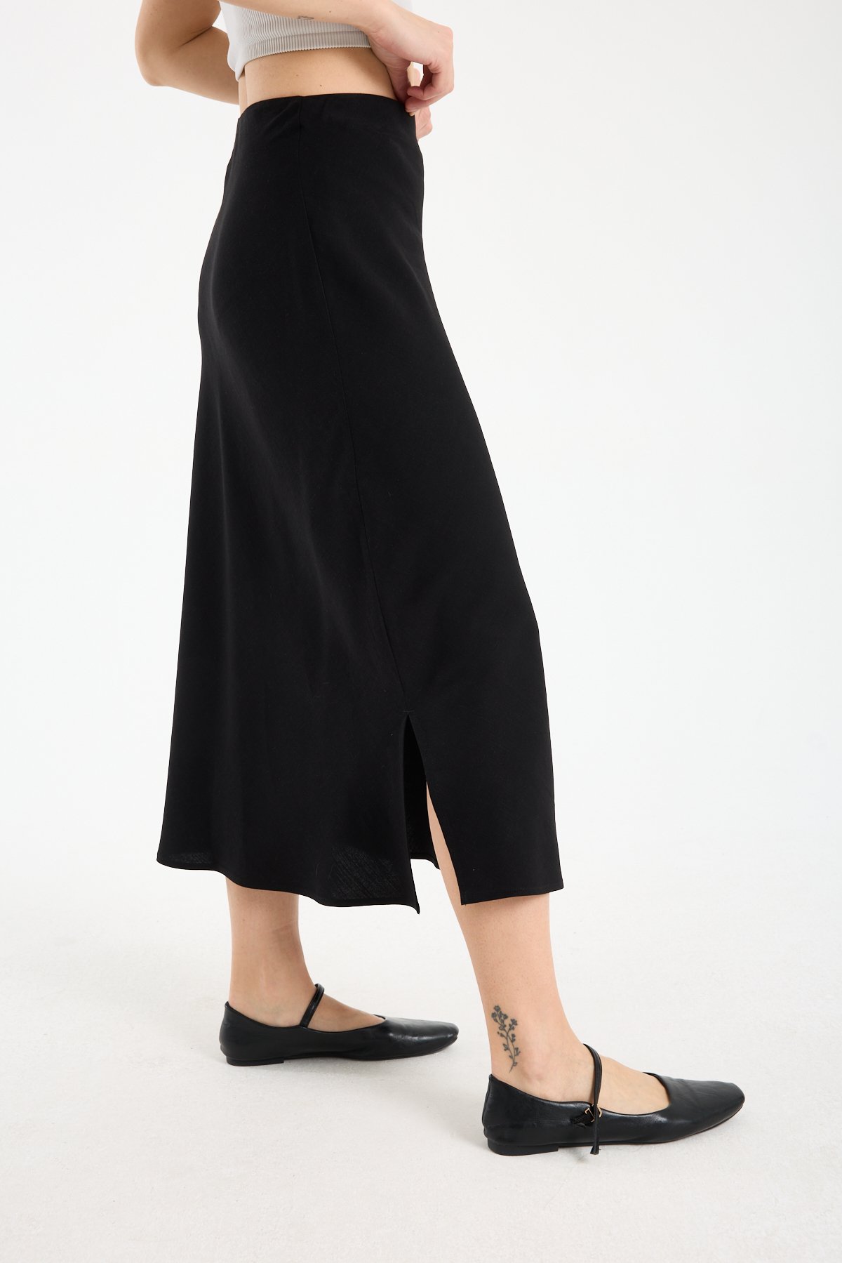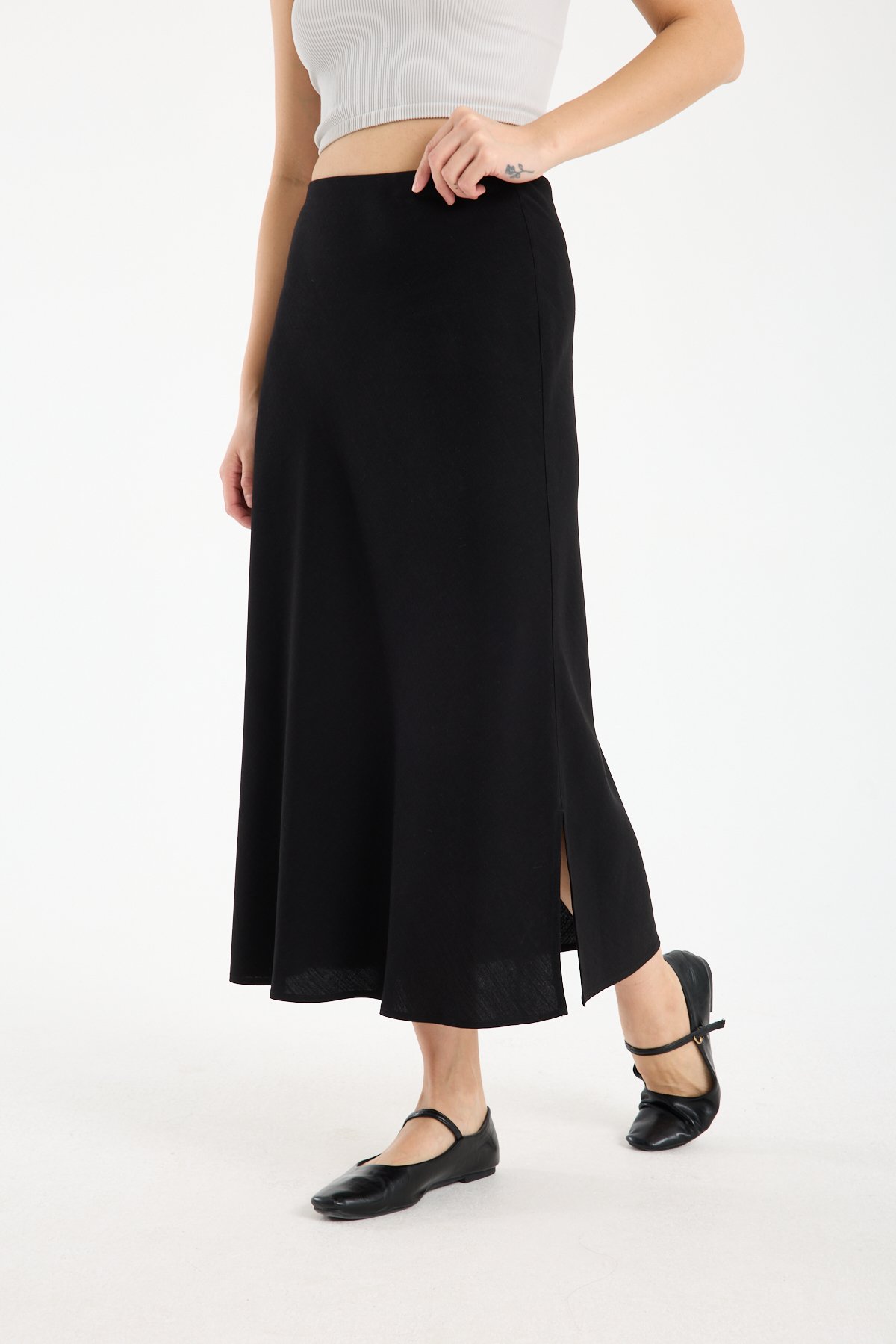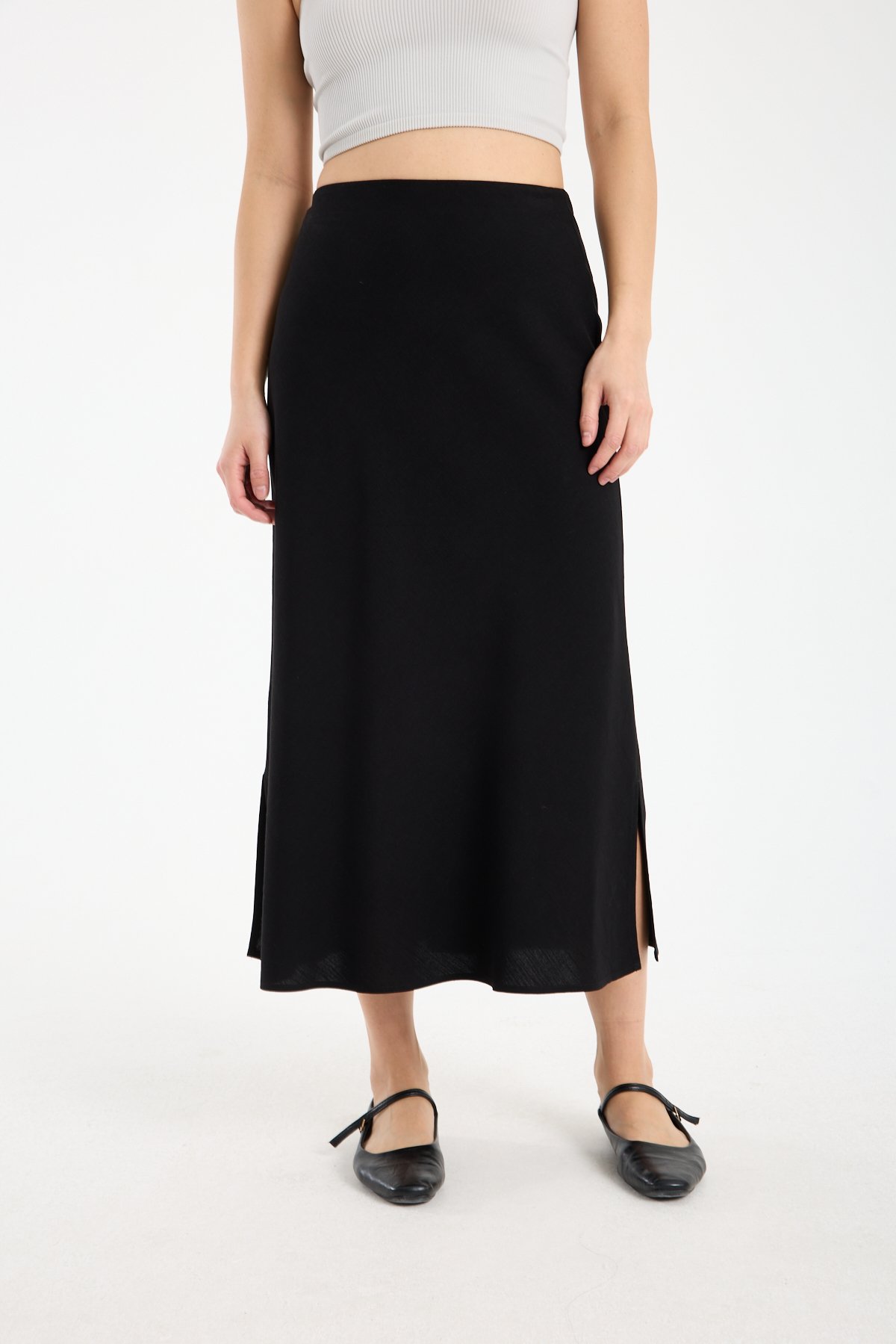 Kadın Beli Lastikli Dökümlü Yazlık Midi Keten Etek SİYAH - 42