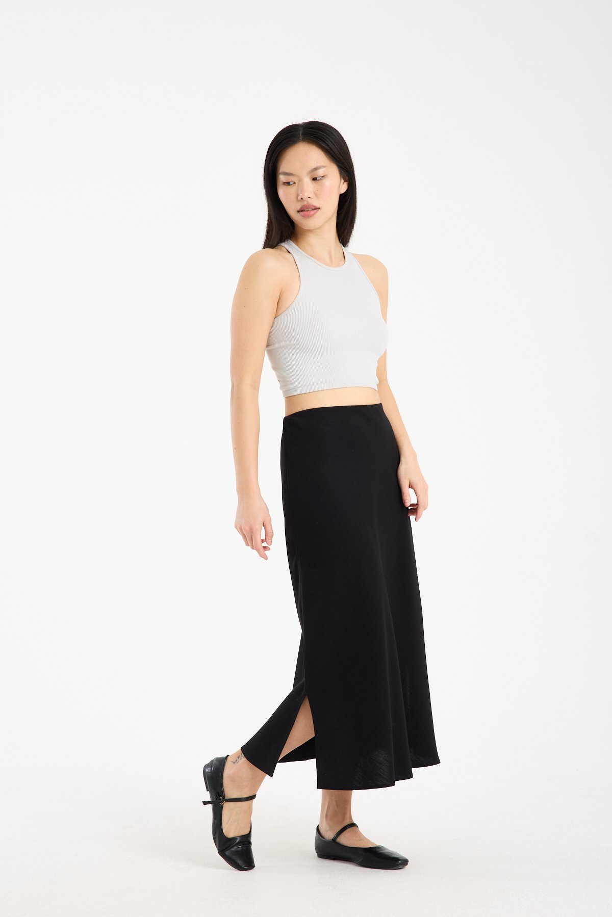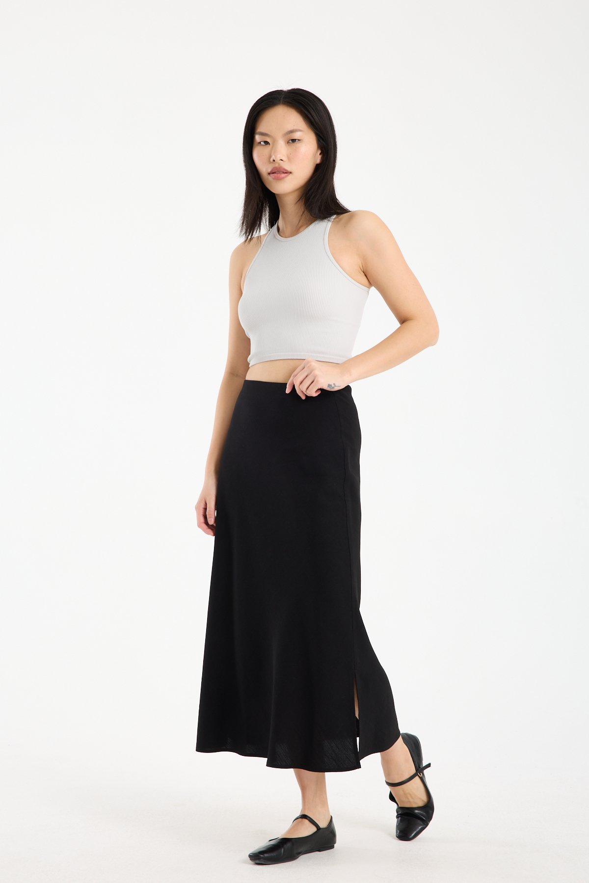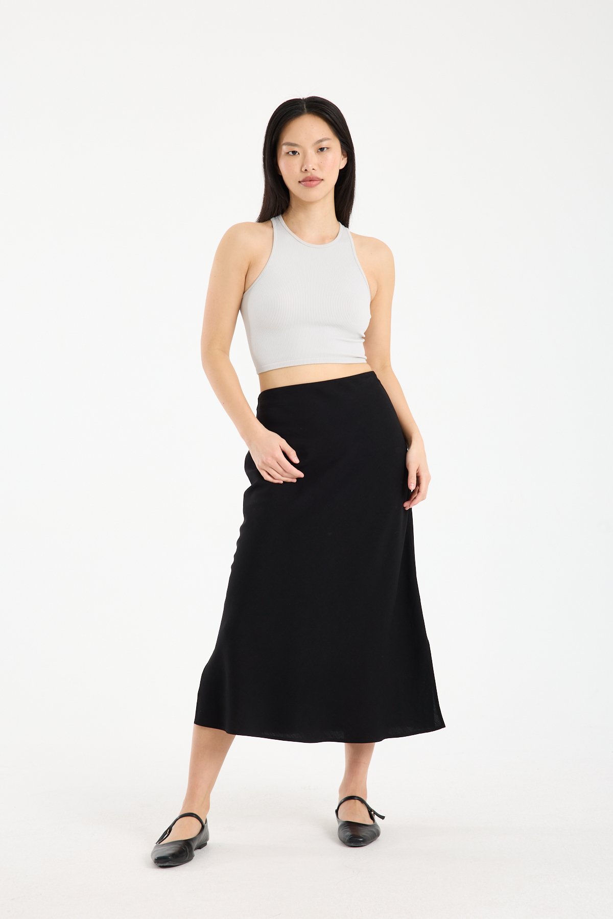 Midi boy kesimi ile hem günlük kombinlerde hem ofis stilinde rahatlıkla tercih edilebilir. Basic tişörtlerden gömleklere kadar birçok parça ile uyum sağlayan bu lastikli bel keten etek, gardırobun zamansız parçalarından biri olmaya adaydır.
