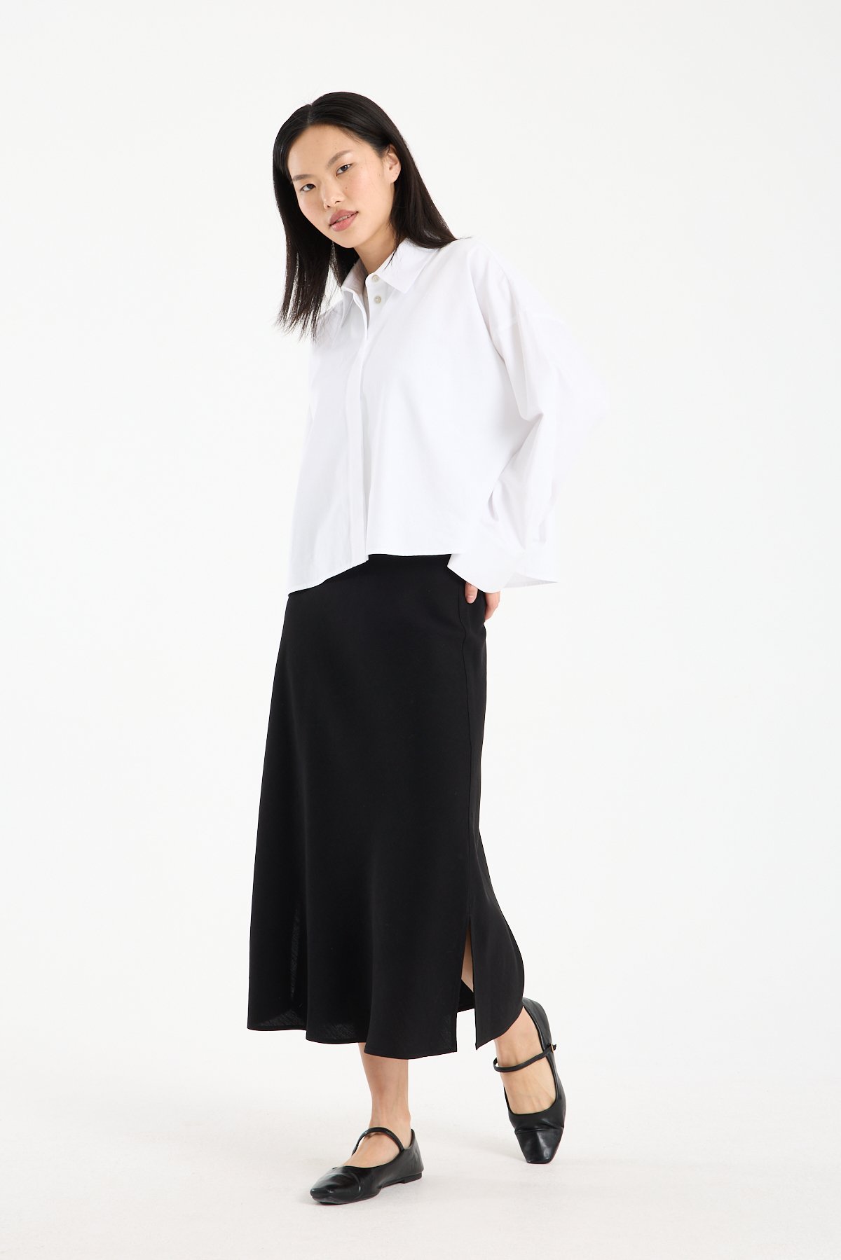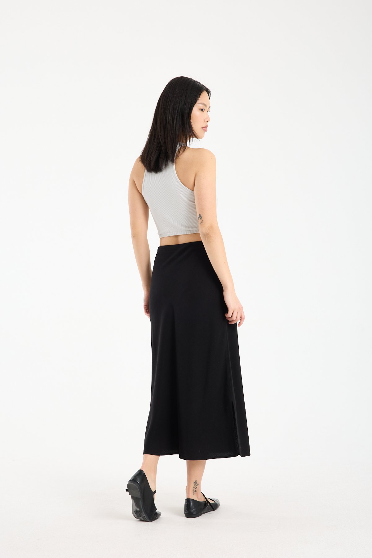 Doğal dokusu ve zamansız formuyla öne çıkan bu keten karışımlı midi etek, %71 viskon %29 keten kumaş içeriği sayesinde hafif, nefes alabilen ve konforlu bir kullanım sunar. Viskonun akıcı yapısı eteğe zarif bir dökümlülük kazandırırken, keten içeriği doğal ve sofistike bir görünüm sağlar.