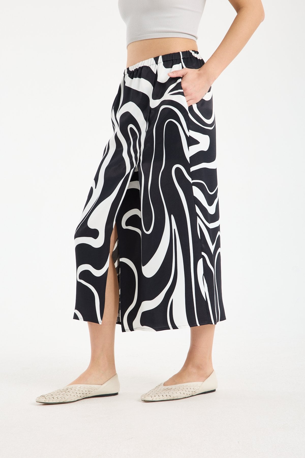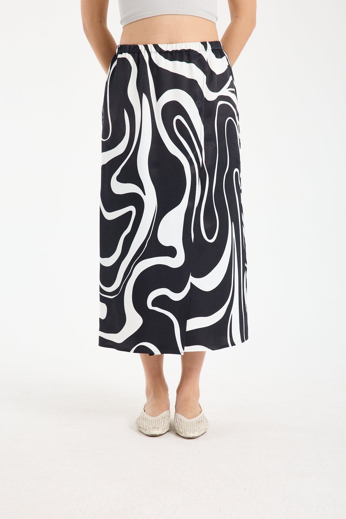 Kadın Desenli Kruvaze Kesim Beli Lastikli Saten Midi Etek SİYAH-BEYAZ - 42
