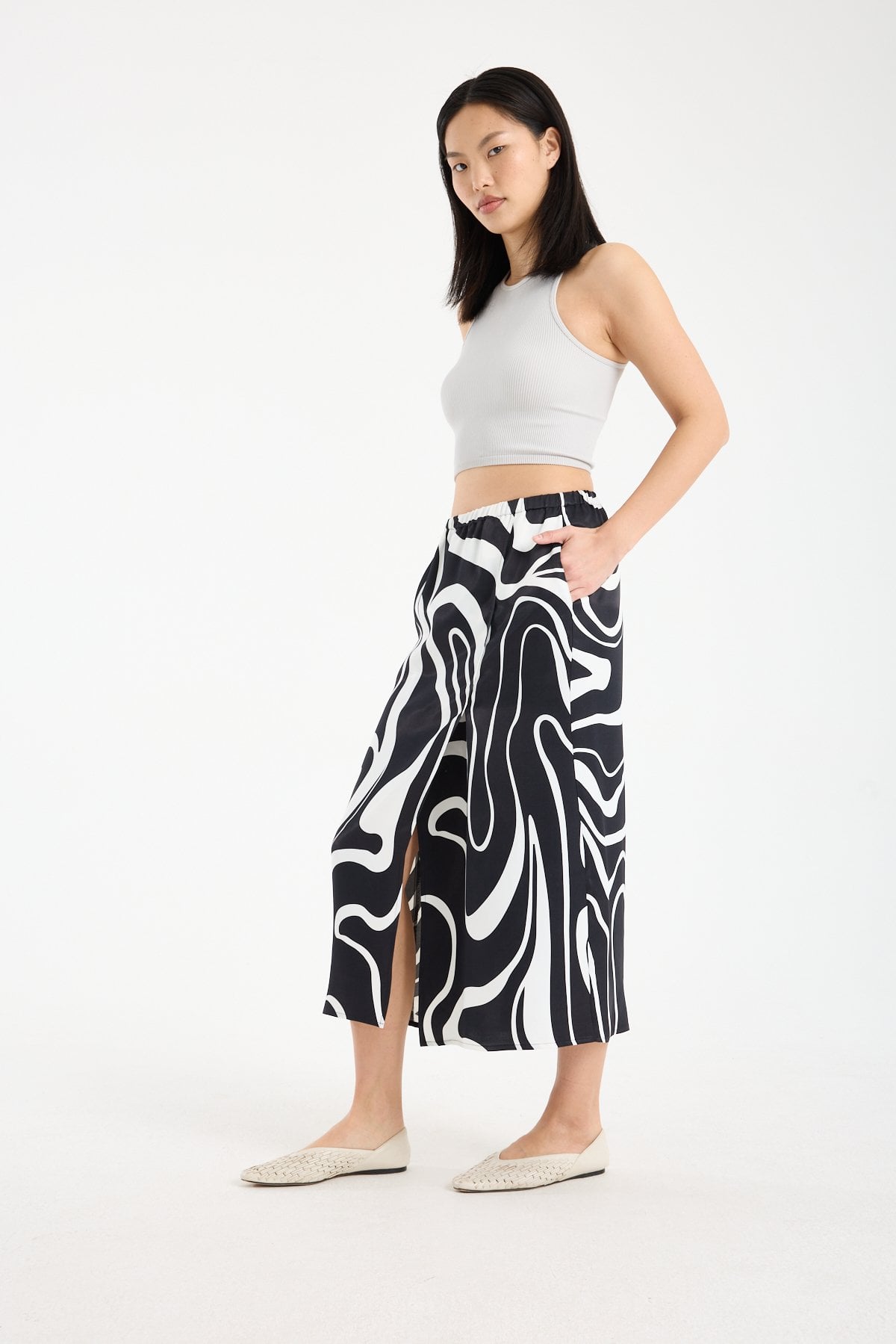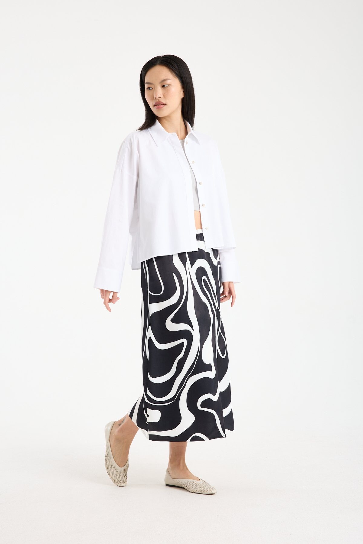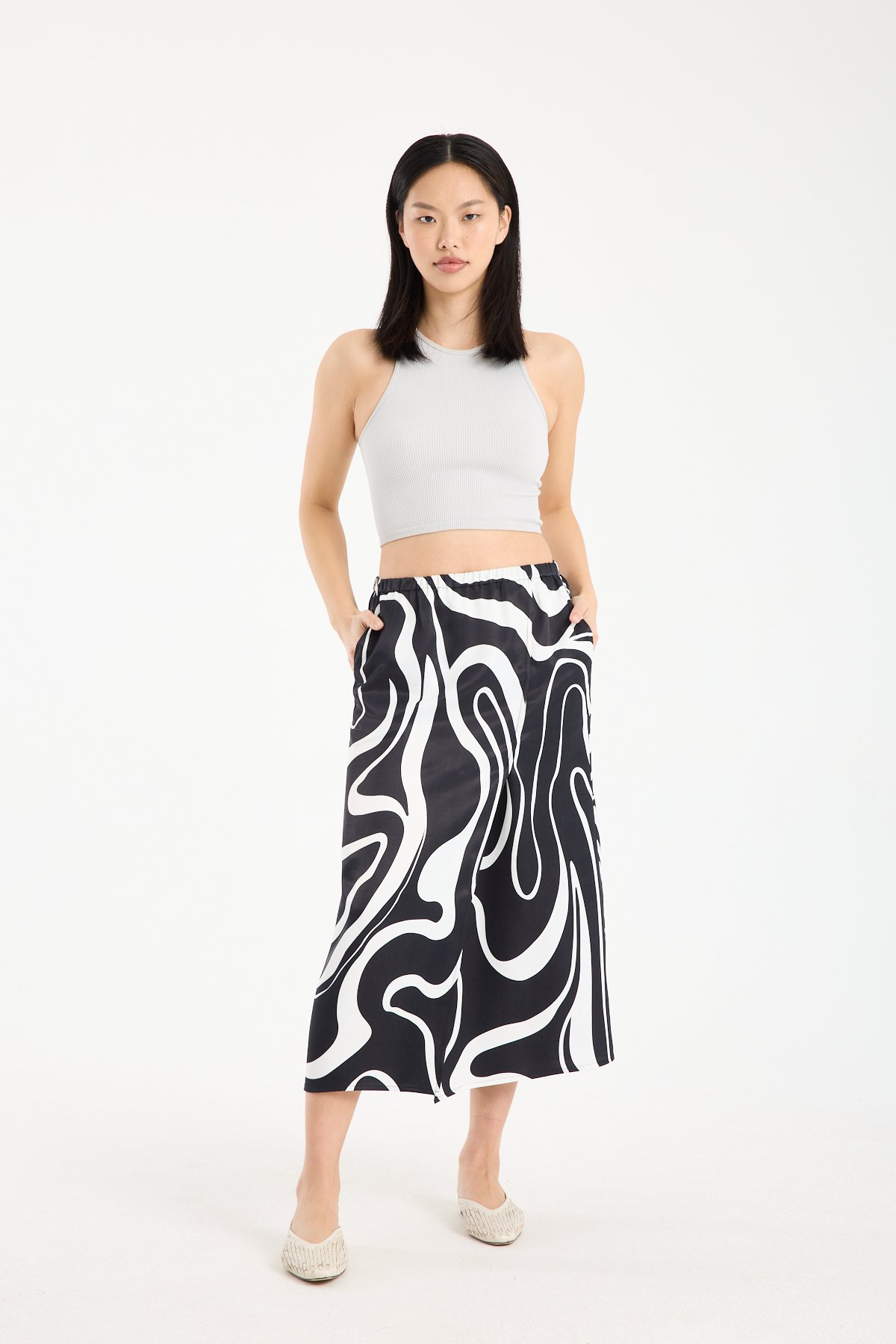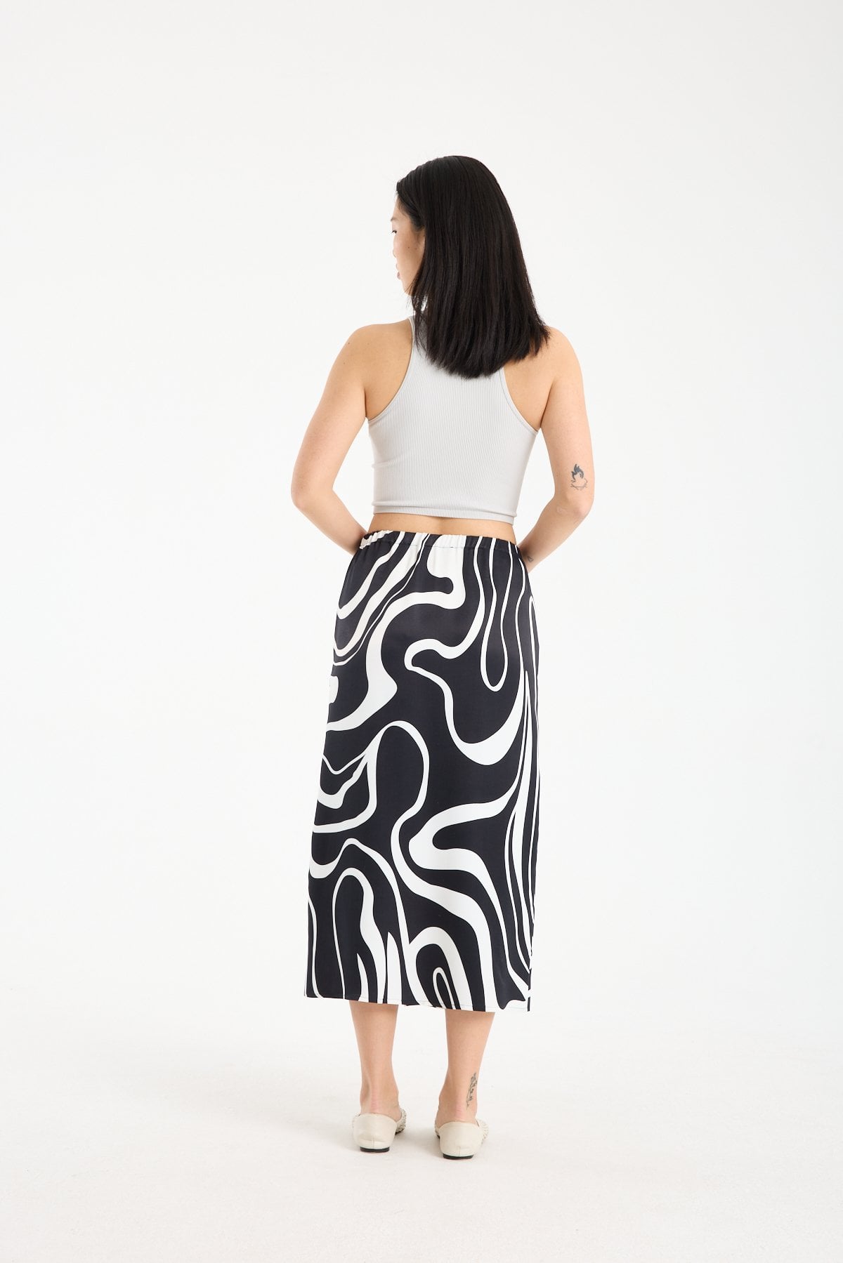 Soyut ve iddialı desen yapısı sayesinde sade üstlerle kombinlendiğinde stilin odak noktası haline gelir. Basic tişört, crop top, gömlek veya triko üstlerle rahatlıkla tamamlanabilir. Desenli viskon midi etek arayanlar için konforlu, akıcı ve dikkat çekici bir alternatif sunar.