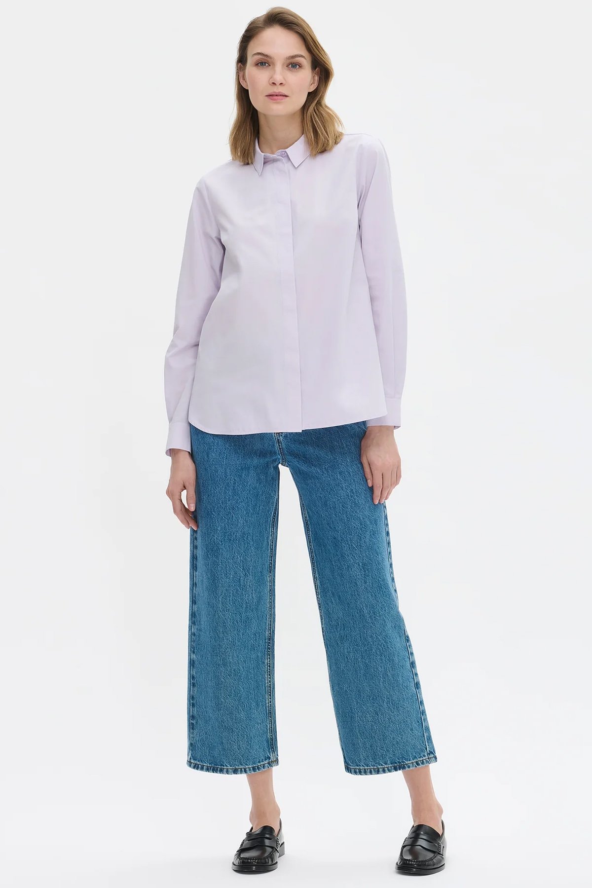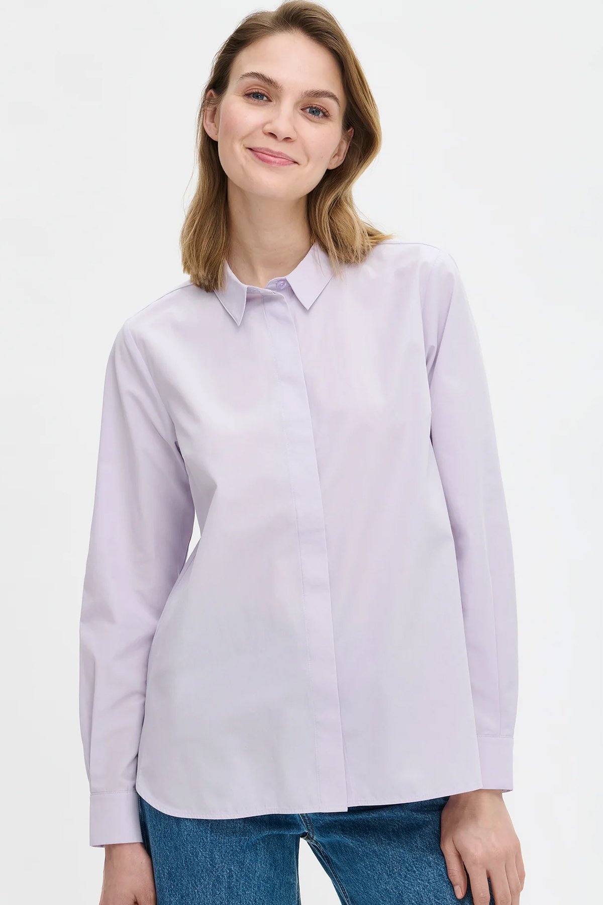 Kadın Düz Gizli Patlı Pamuklu Uzun Kollu Gömlek LİLA - 48