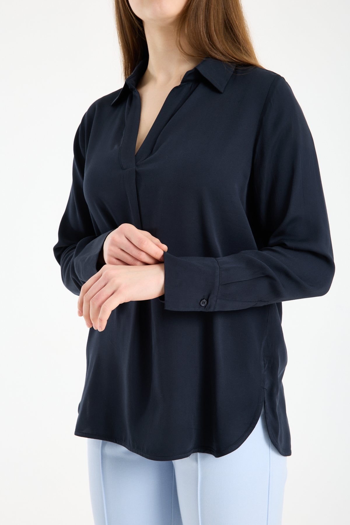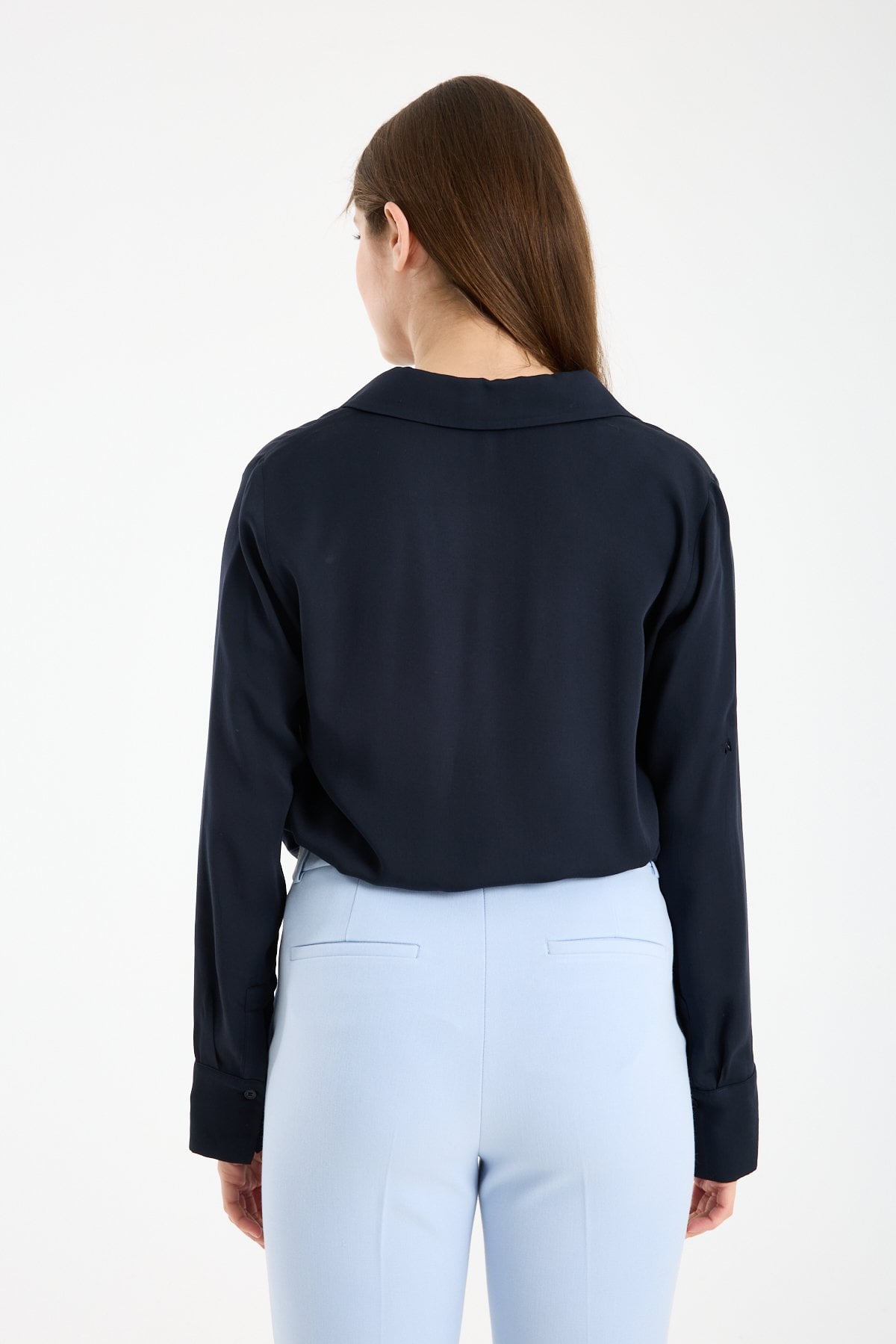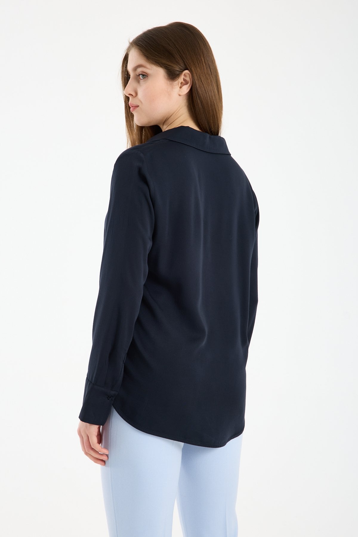 Kadın Gömlek Yaka Uzun Kollu İpeksi Saten Bluz LACİVERT - 40