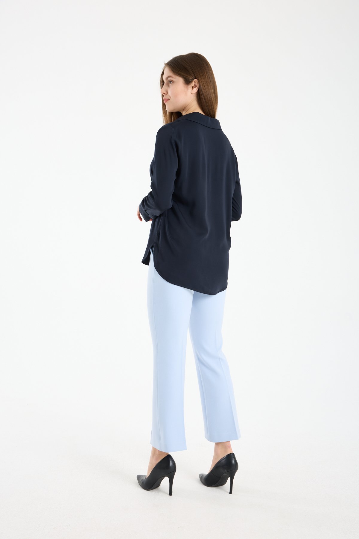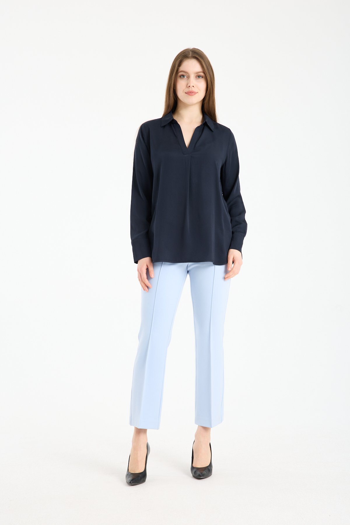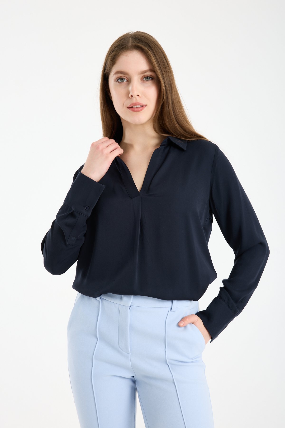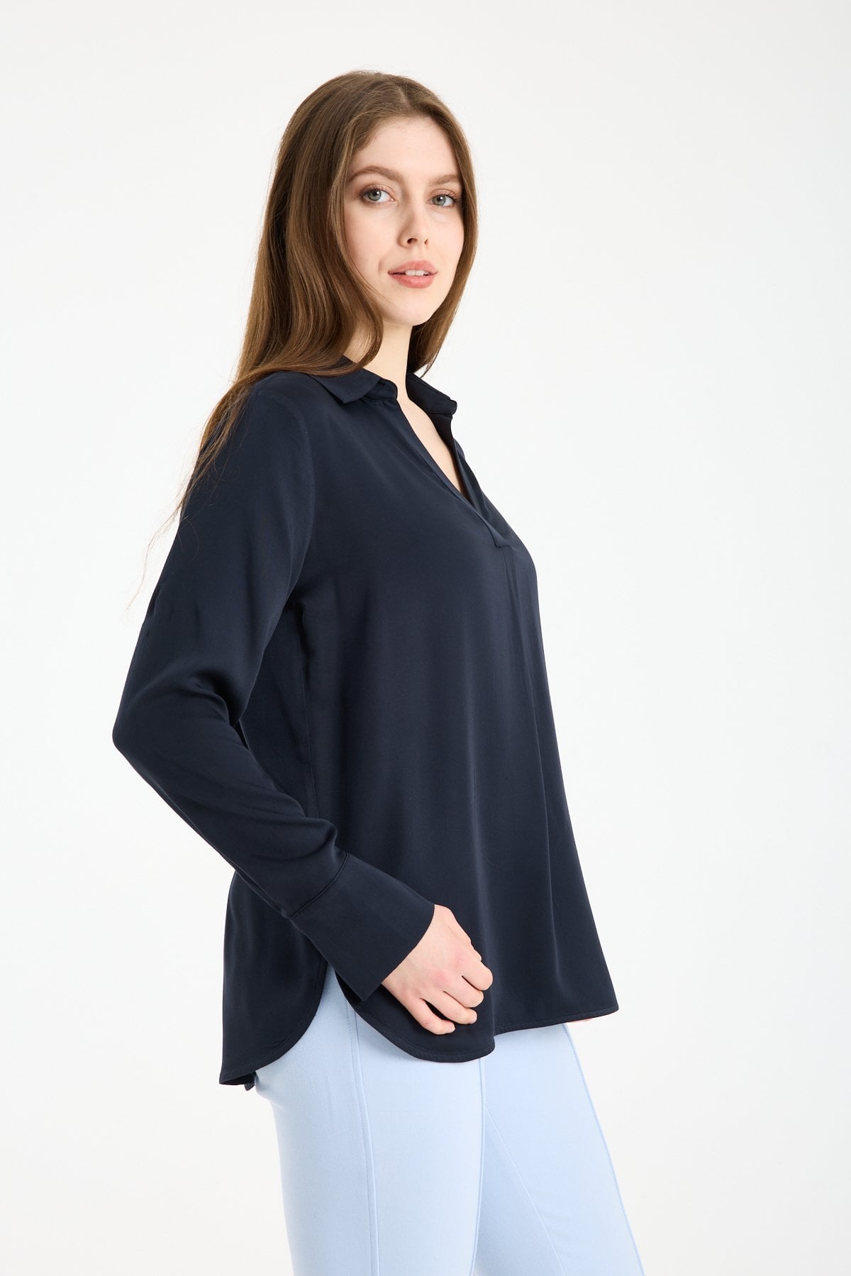 Kadın Gömlek Yaka Uzun Kollu İpeksi Saten Bluz LACİVERT - 40