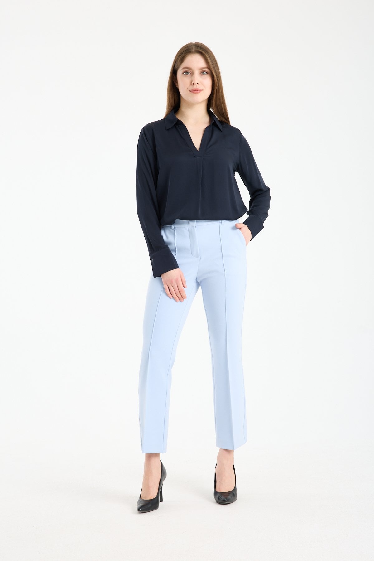 Viskon kumaşın doğal dökümlü yapısı sayesinde vücuda yapışmaz, rahat bir kullanım sunar. Özellikle kumaş pantolon ve klasik kesim altlarla kombinlendiğinde güçlü bir stil dengesi oluşturur.