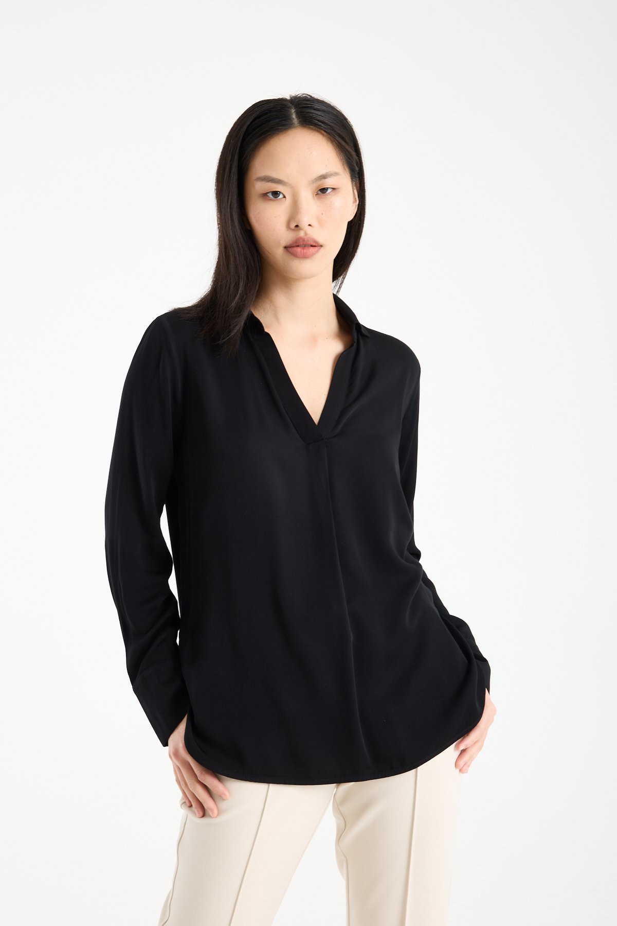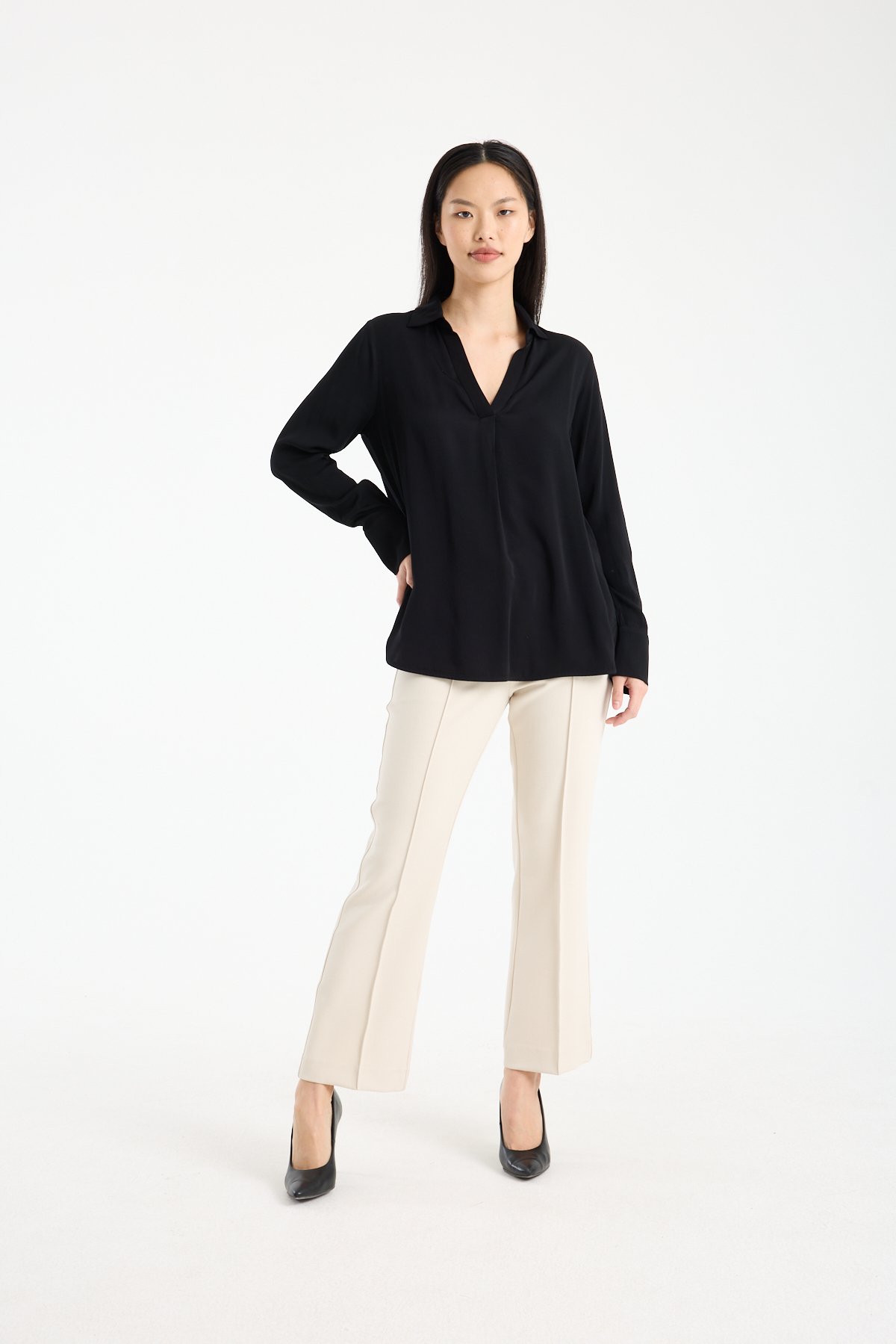 Klasik gömlek yaka detayı modele daha düzenli ve şık bir görünüm kazandırır. Ön kısmındaki düğmesiz V açıklık, tasarımı sade ama modern bir çizgiye taşır. Uzun kollu ve manşetli yapısı sayesinde hem ofis kombinlerinde hem günlük şık stillerde rahatlıkla kullanılabilir. Yan yırtmaç detayı hareket alanı sağlar ve bluzun daha akıcı durmasına yardımcı olur.