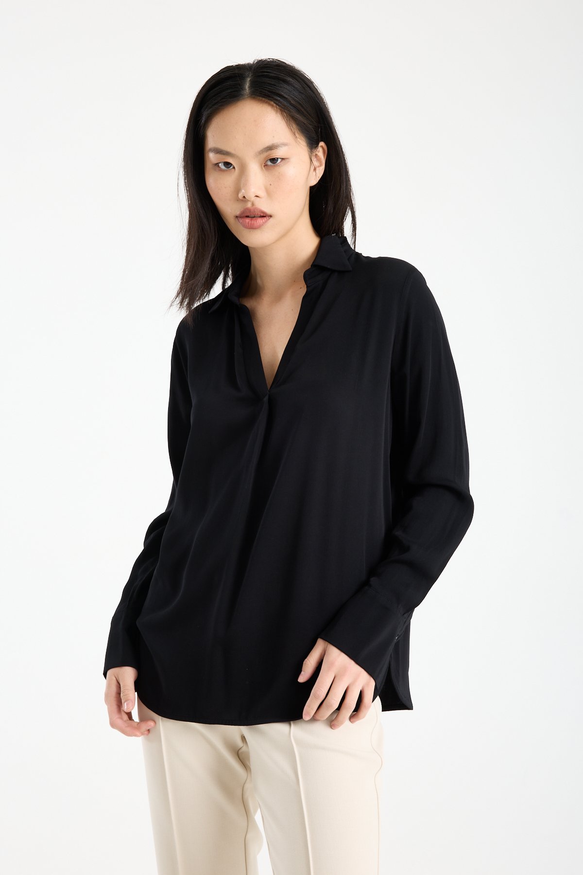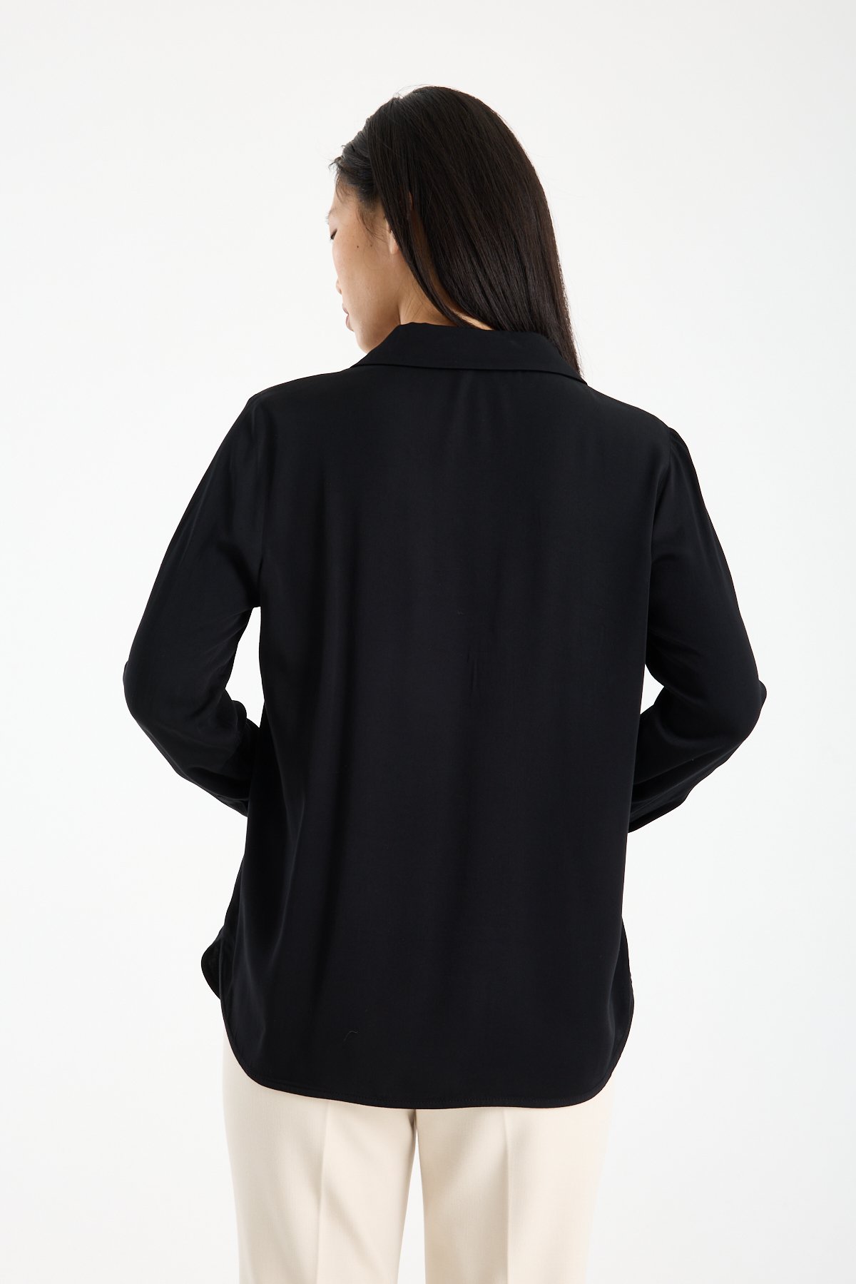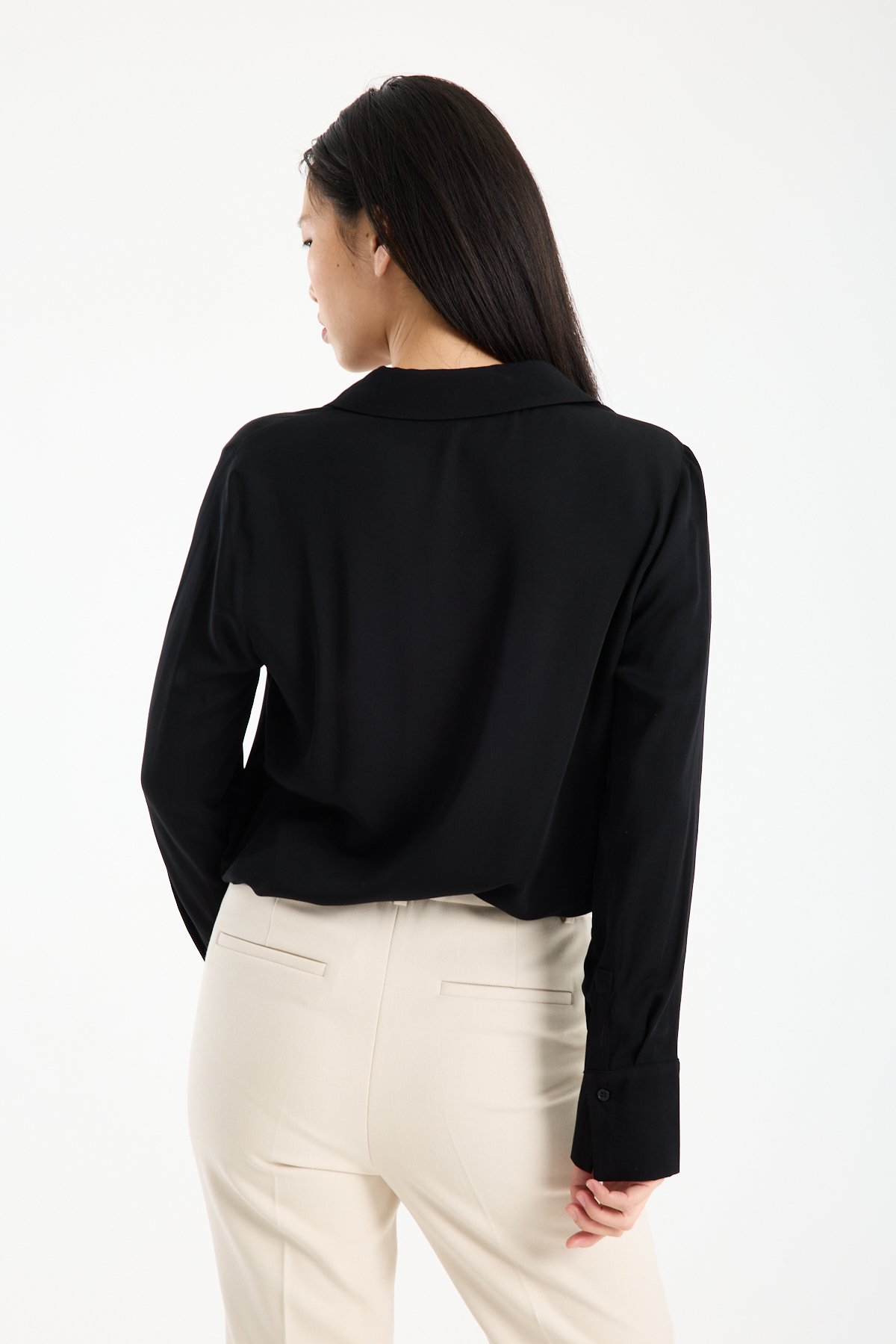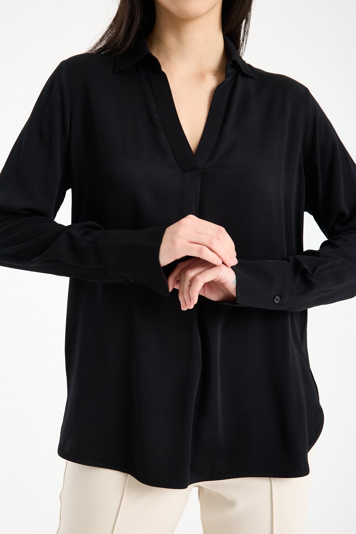 Kadın Gömlek Yaka Uzun Kollu İpeksi Saten Bluz SİYAH - 42