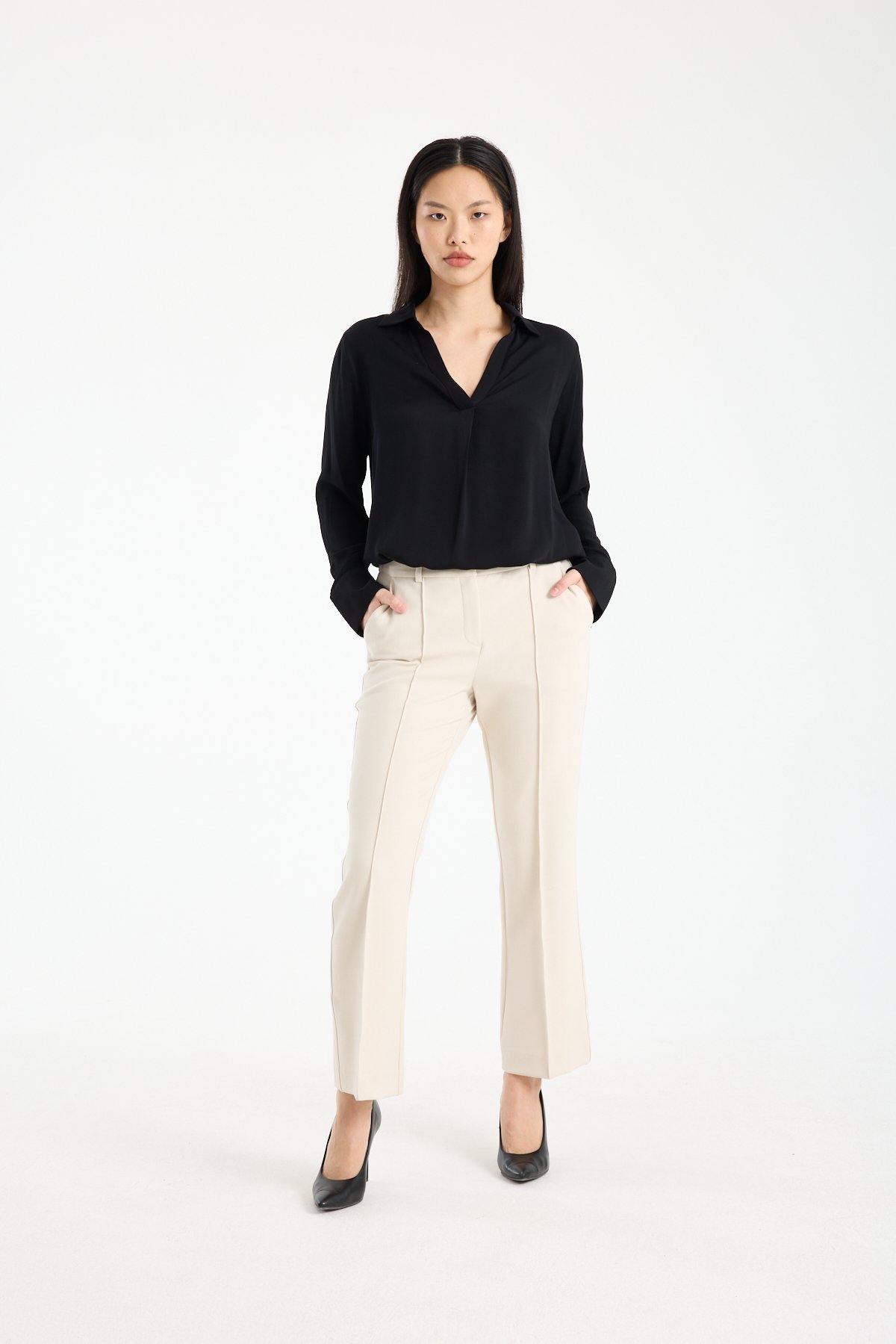 Viskon kumaşın doğal dökümlü yapısı sayesinde vücuda yapışmaz, rahat bir kullanım sunar. Özellikle kumaş pantolon ve klasik kesim altlarla kombinlendiğinde güçlü bir stil dengesi oluşturur.