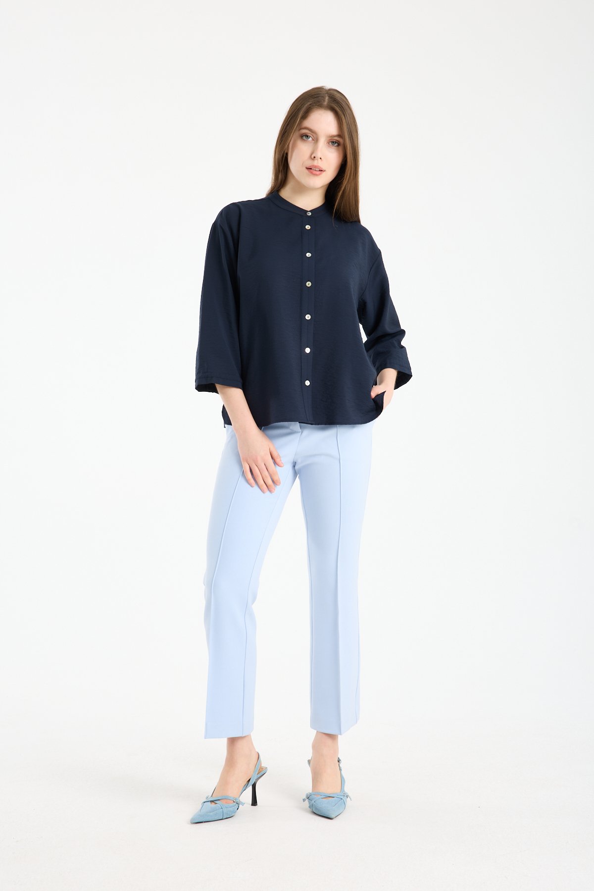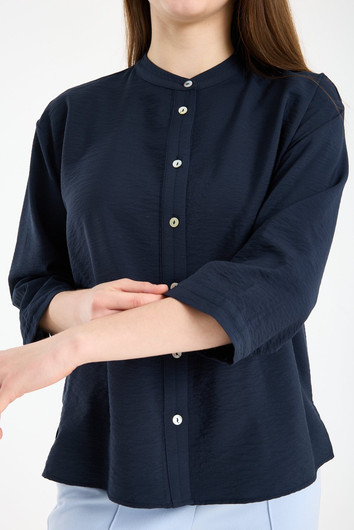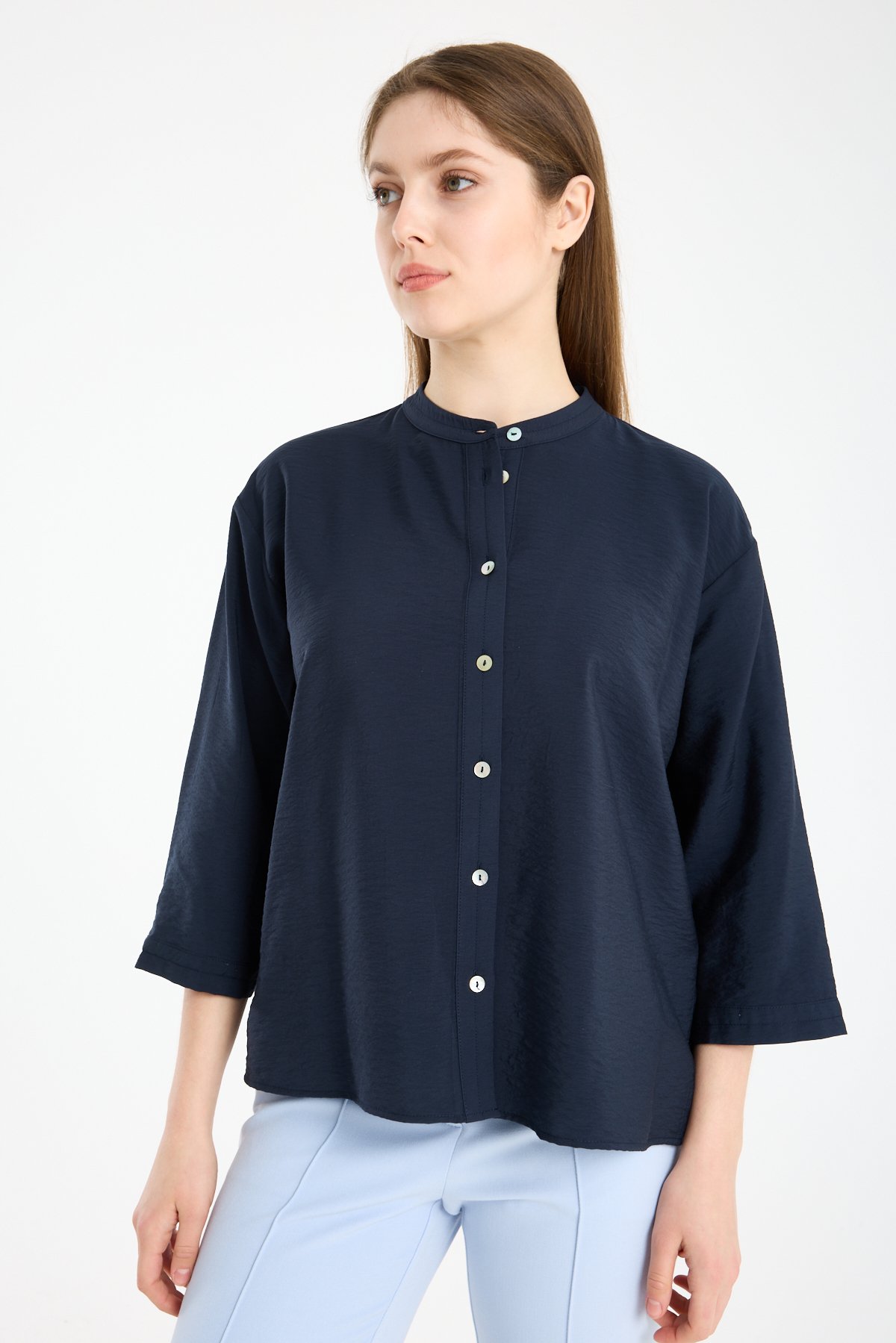 Kadın Hakim Yaka Sedef Düğmeli Yetim Kollu Gömlek LACİVERT - 44