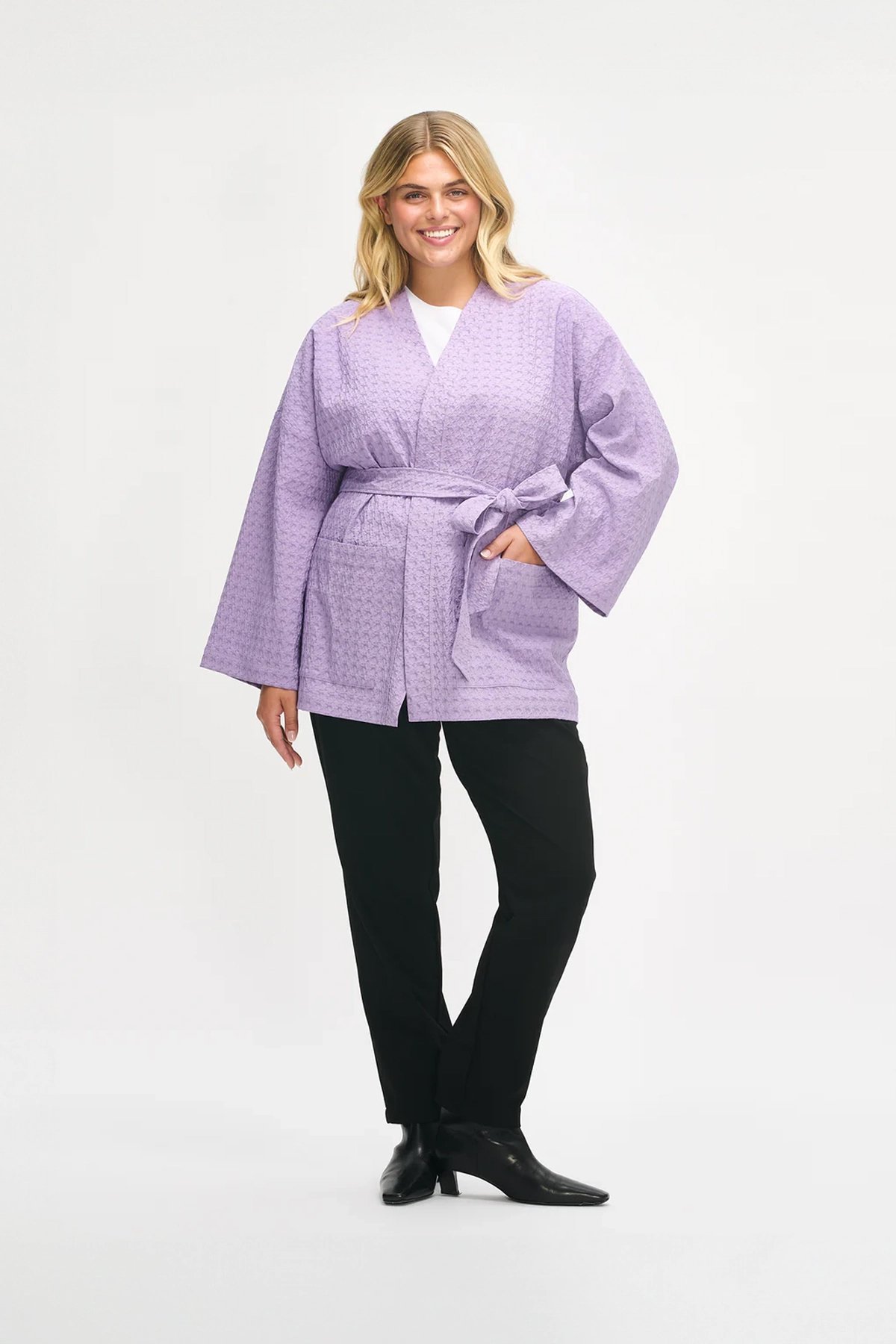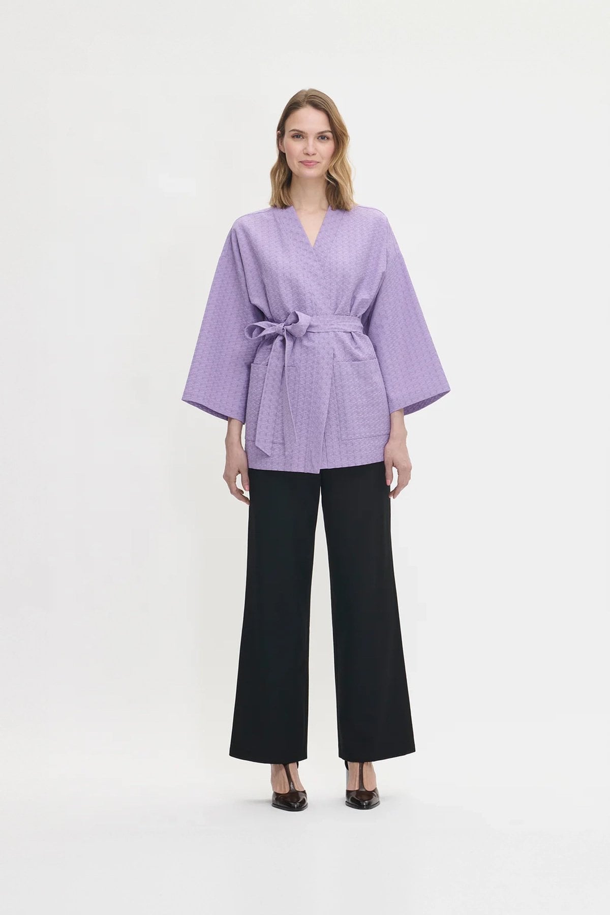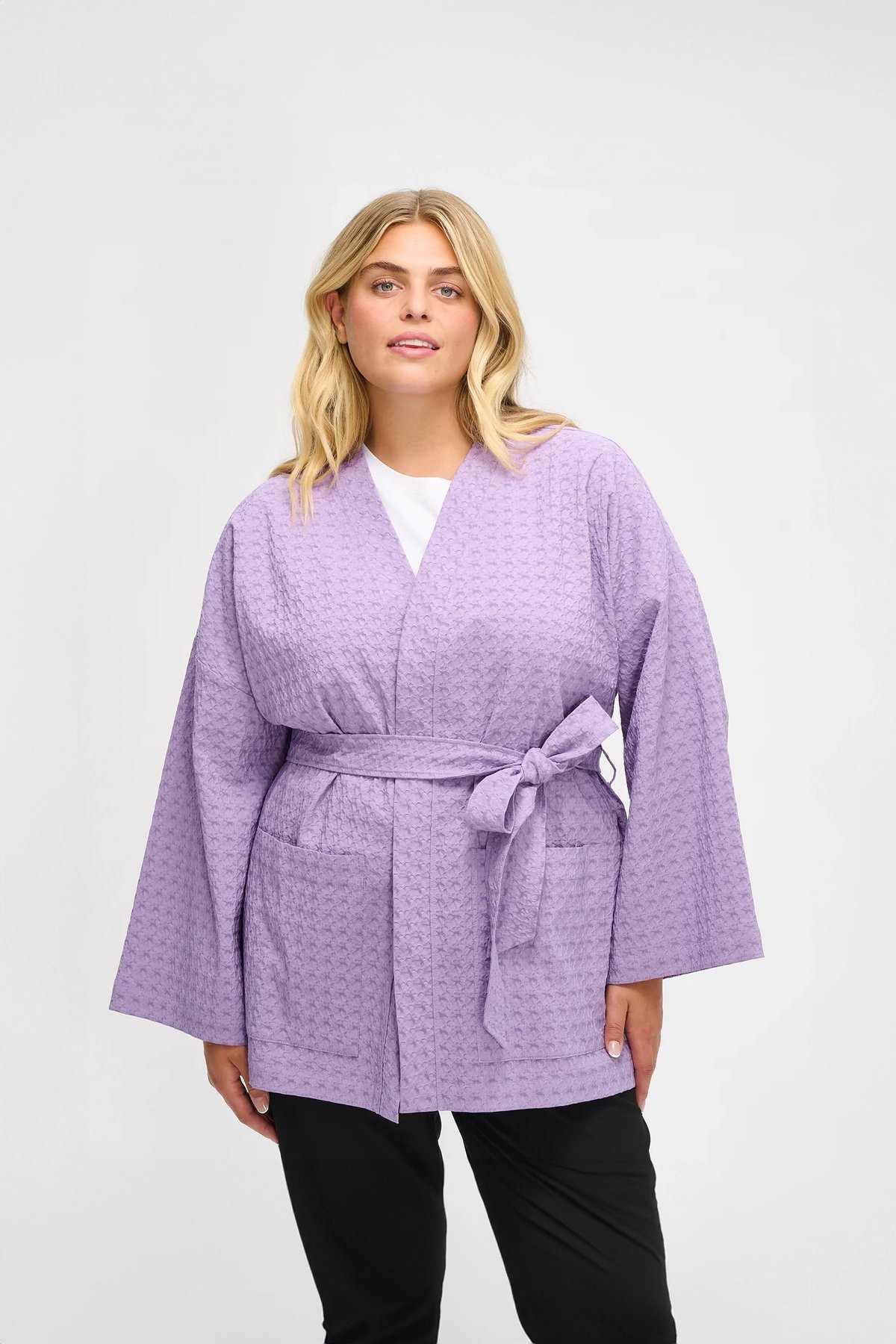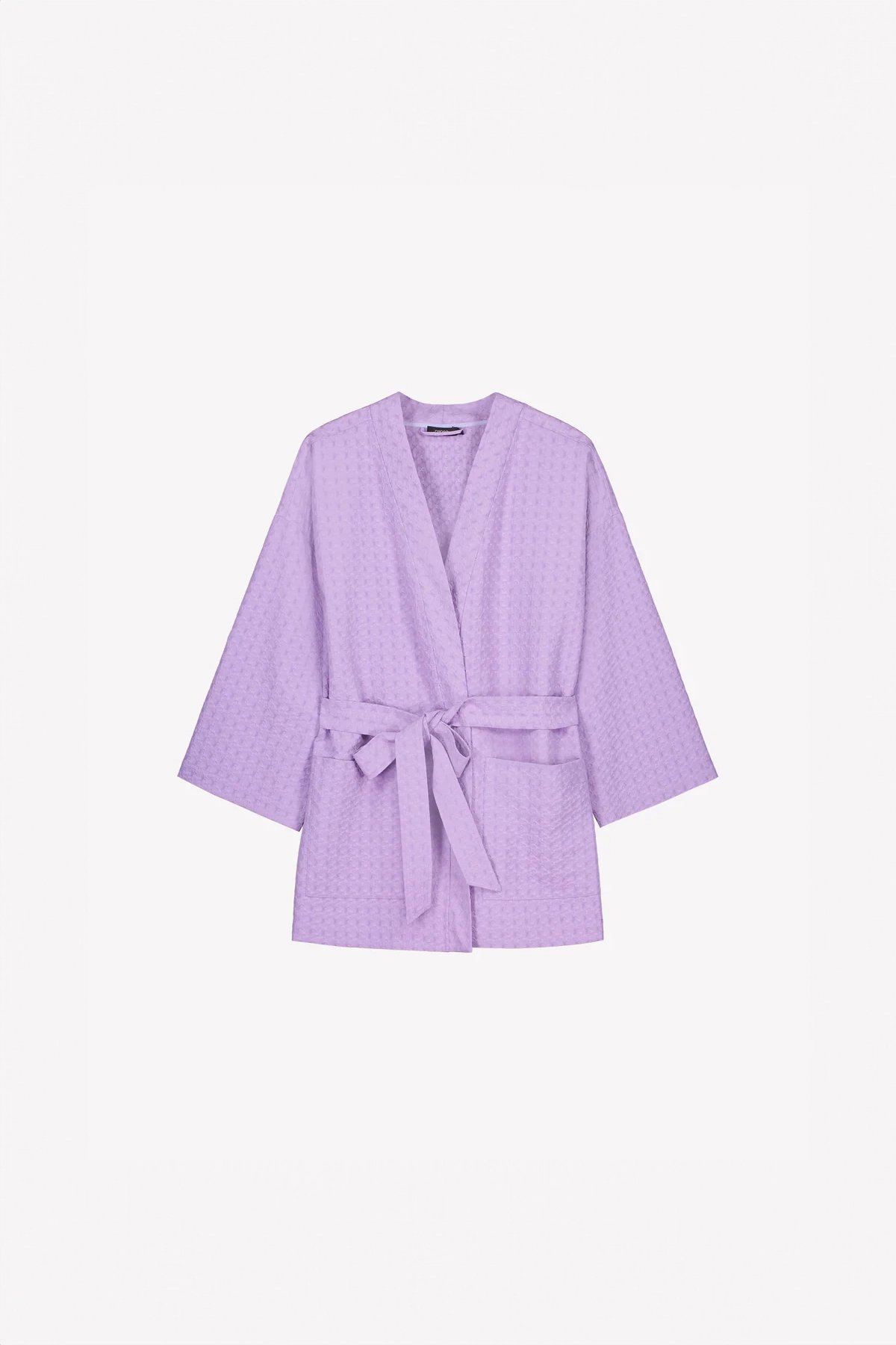Kadın Kabartma Dokulu Kruvaze Kuşaklı Cepli Kimono Ceket LİLA - XXL