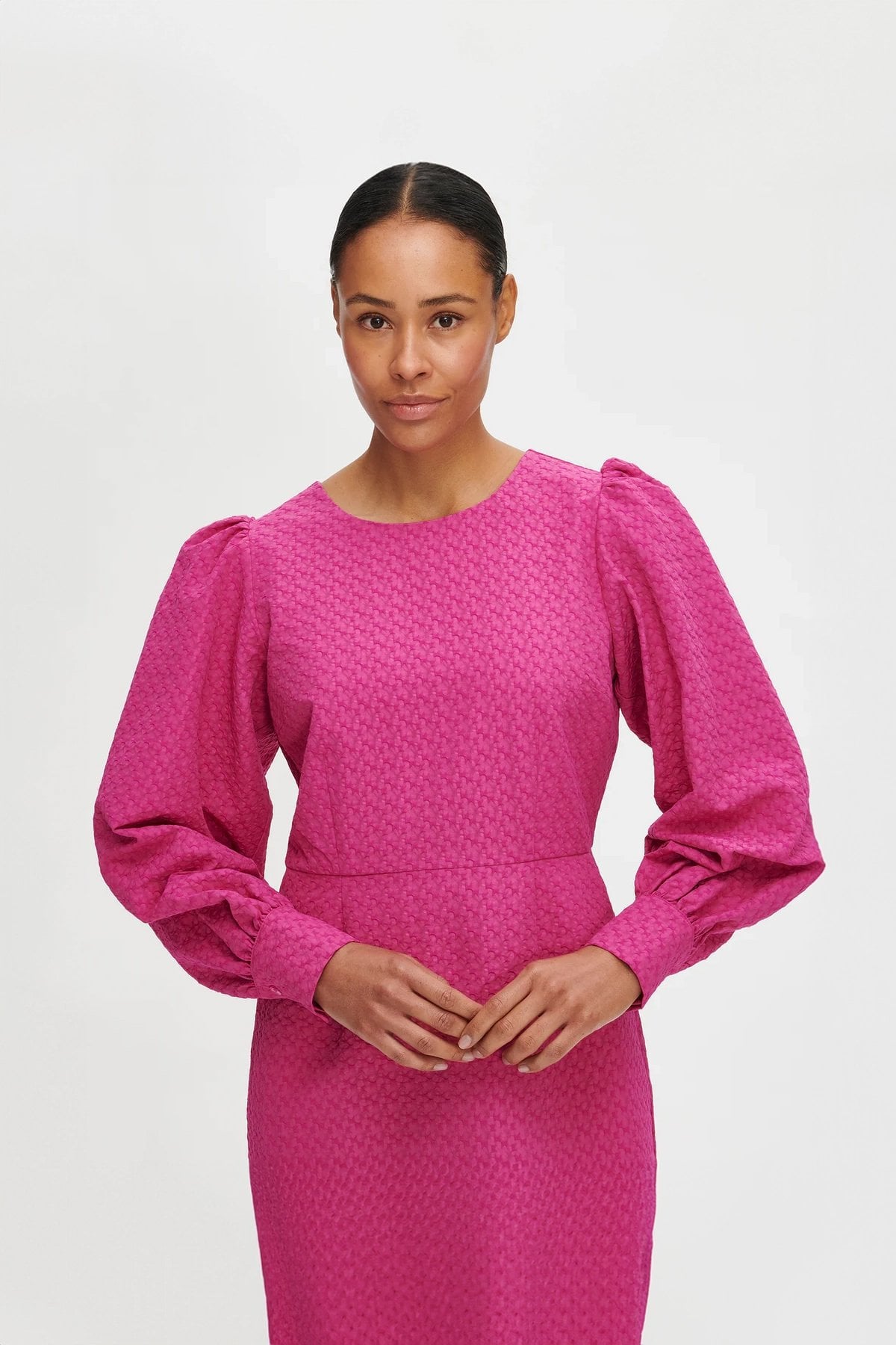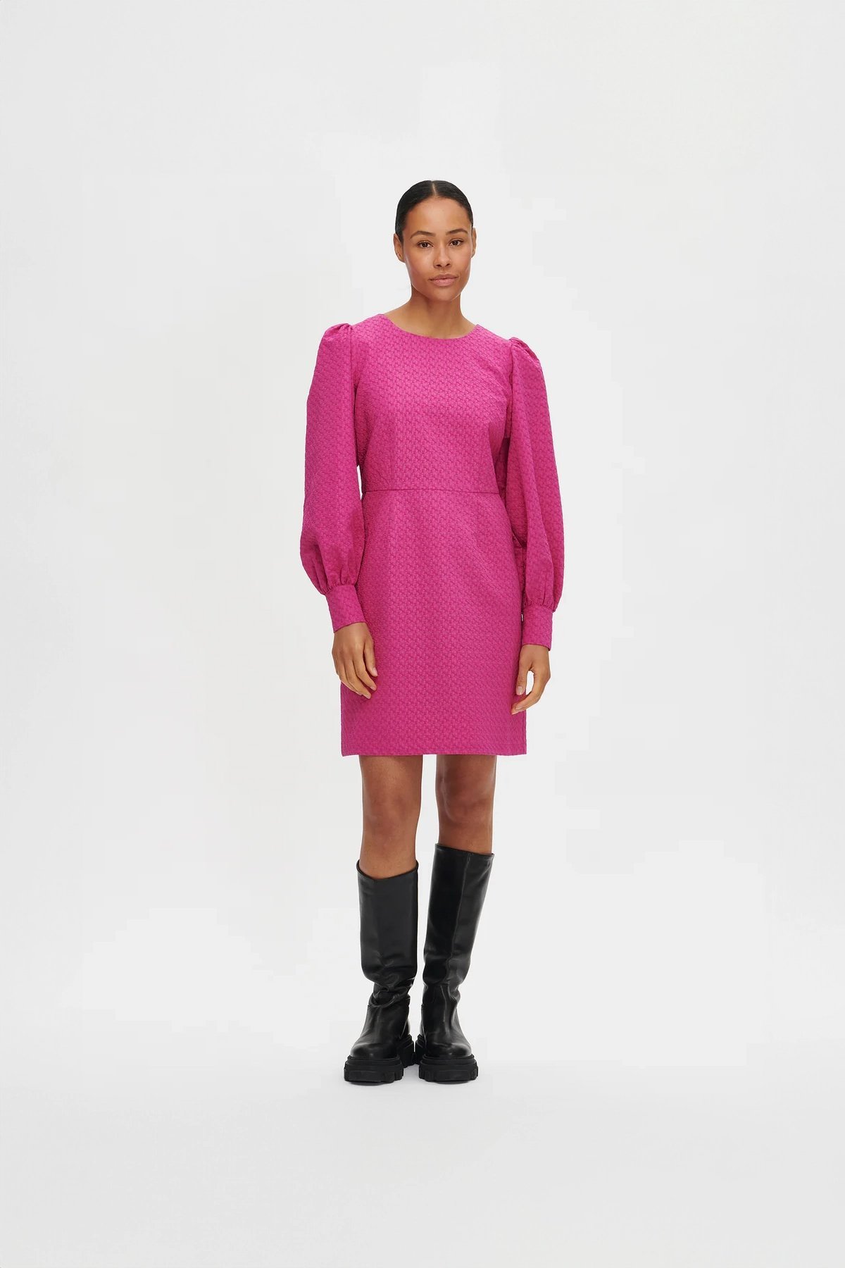 Kadın Kabartma Dokulu Uzun Kollu Balon Kol Diz Üstü Astarlı Elbise FUŞYA - 44