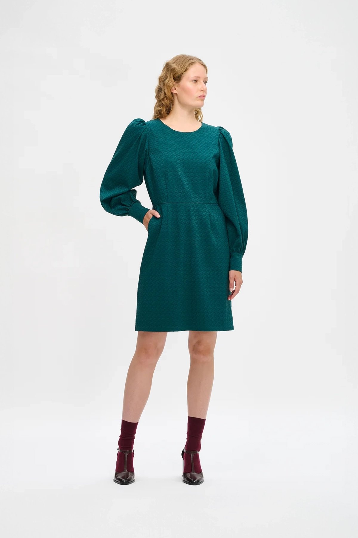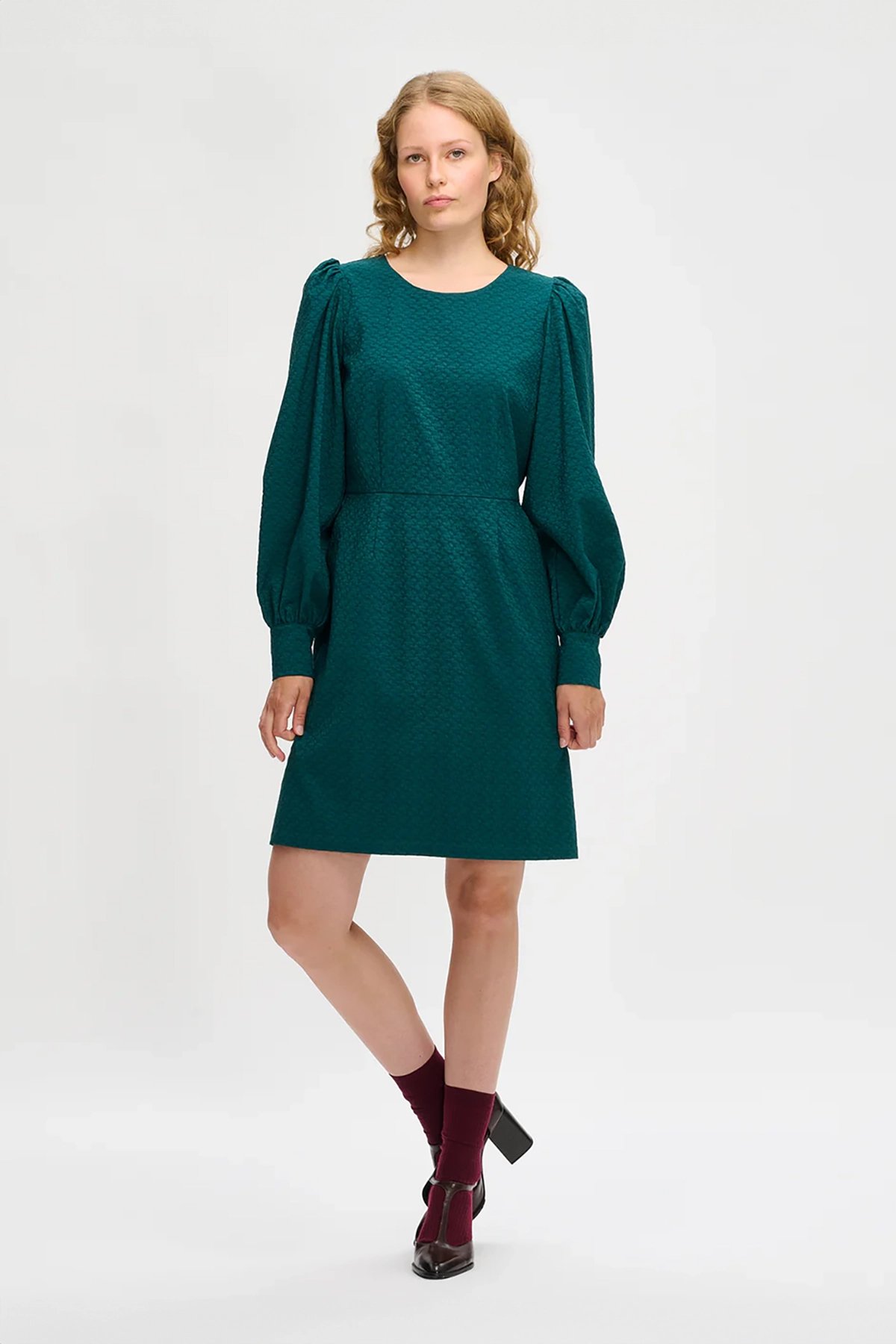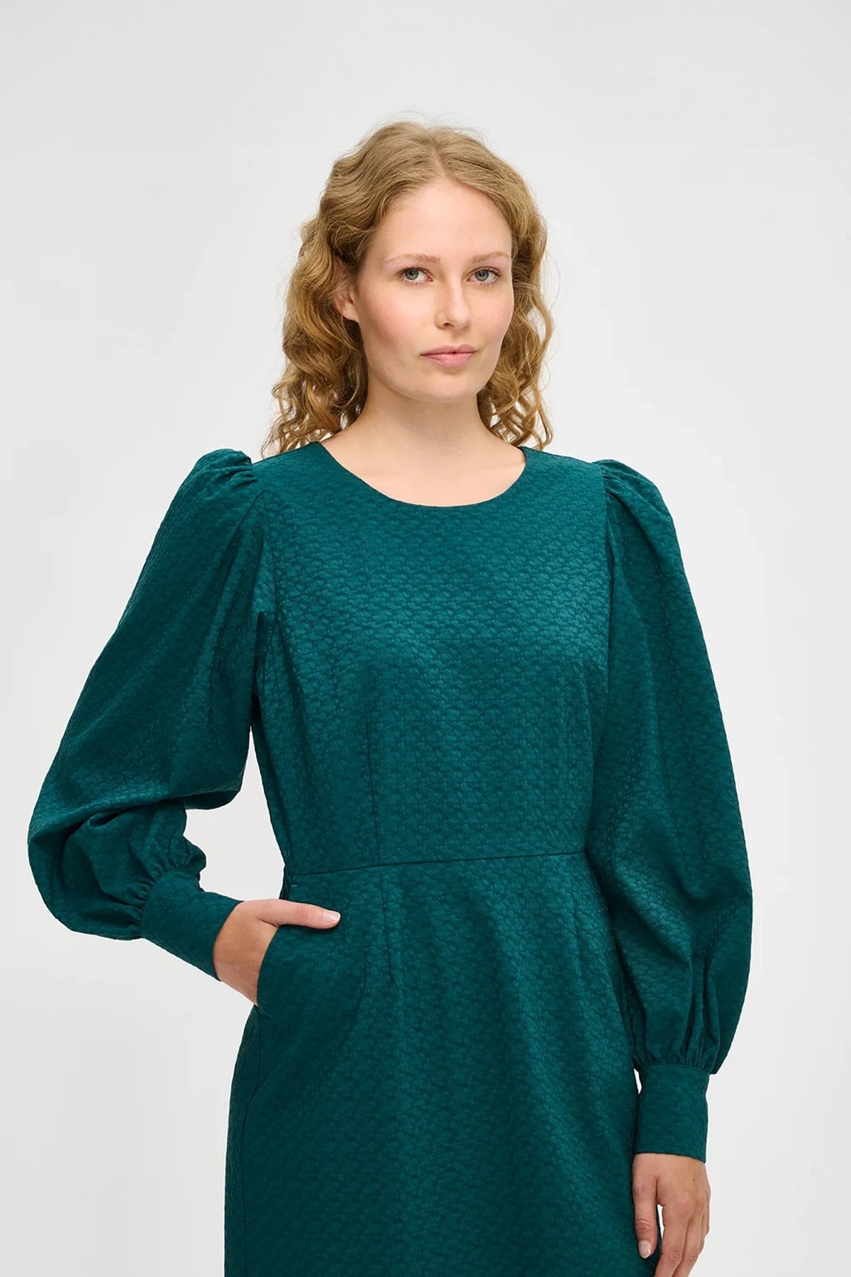 Kadın Kabartma Dokulu Uzun Kollu Balon Kol Diz Üstü Astarlı Elbise YEŞİL - 48