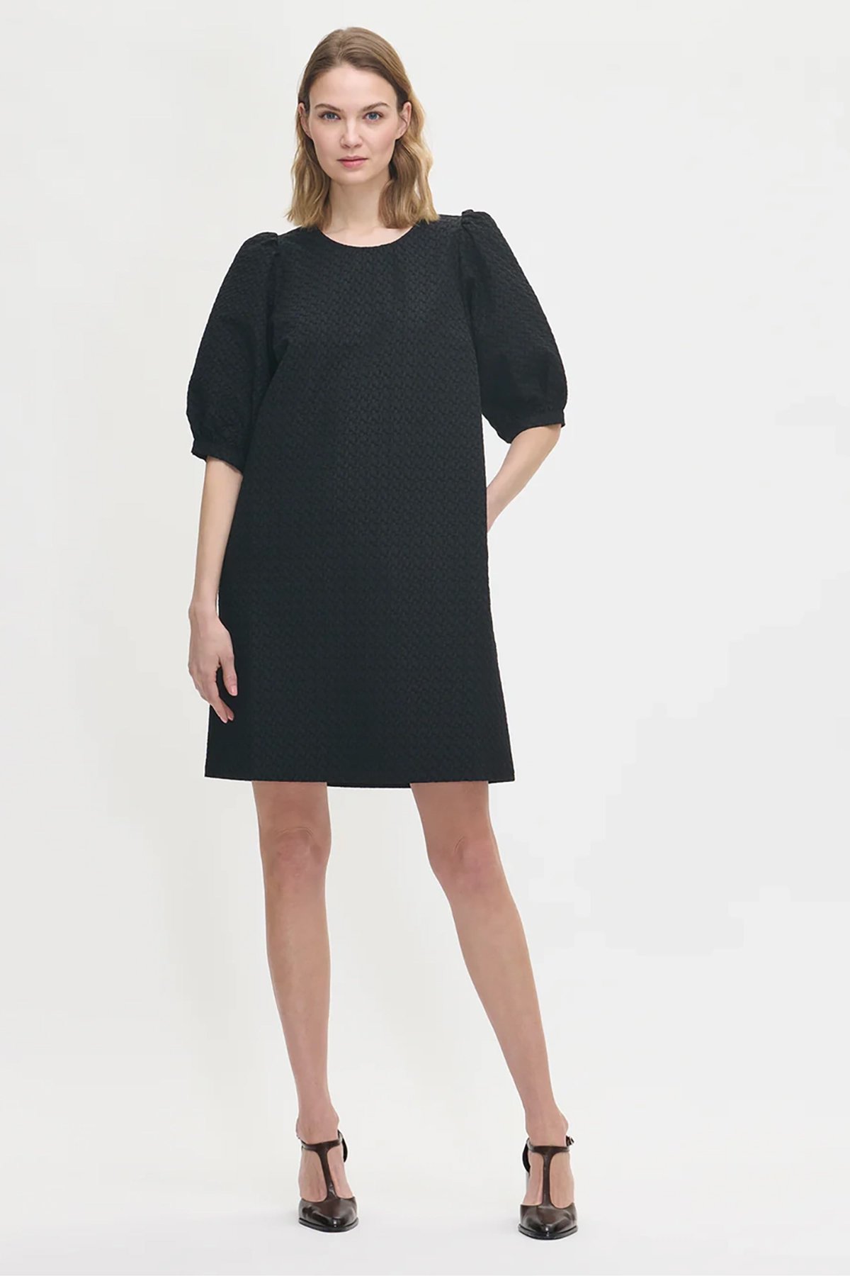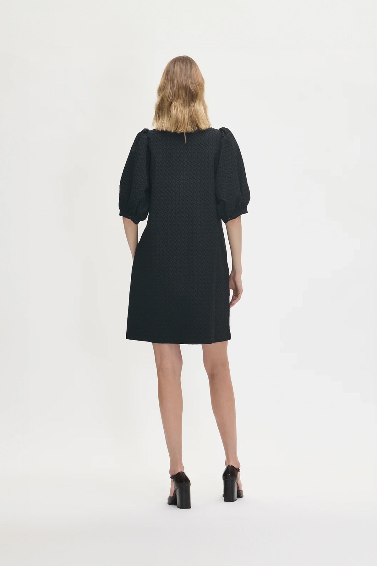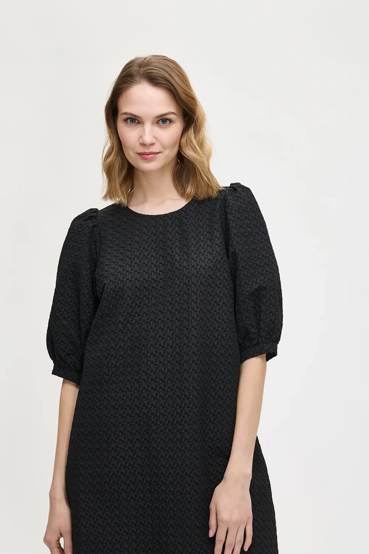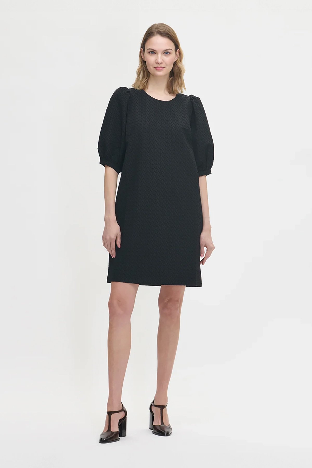 Kadın Kabartmalı Dokulu Yarım Kol Diz Üstü Balon Kol Elbise SİYAH - 48