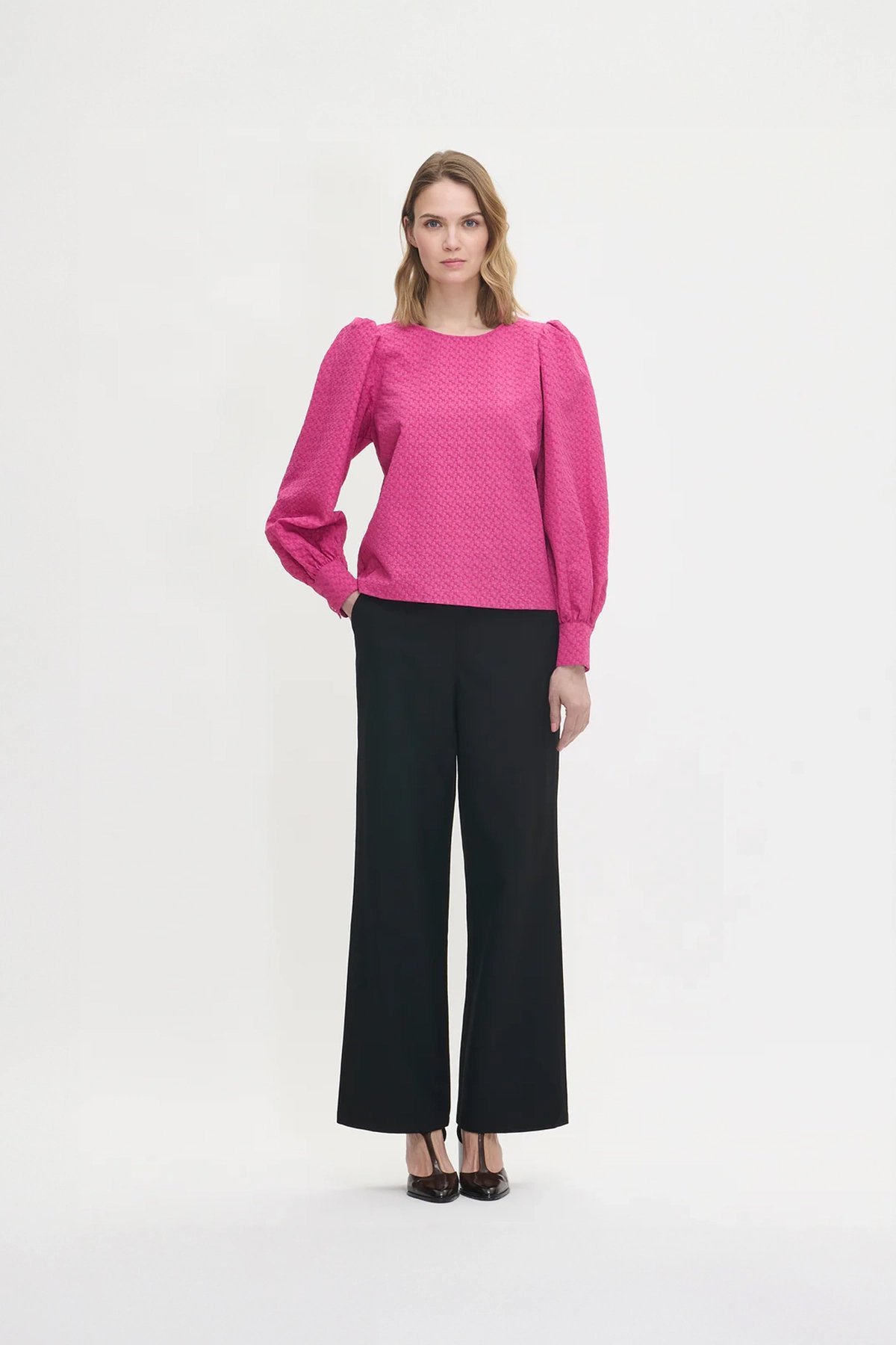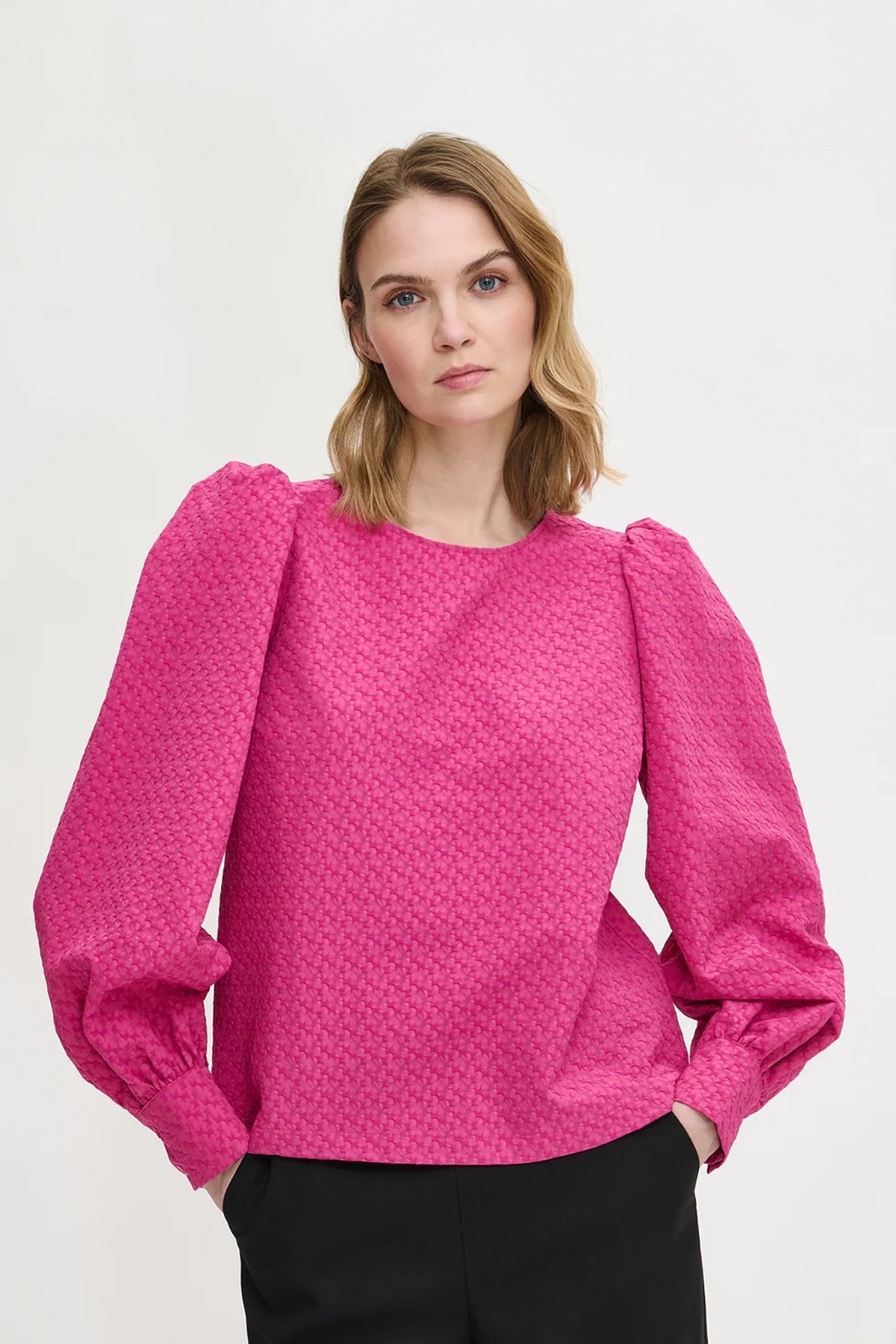 Kadın Kabartmalı Dokulu Uzun Kollu Balon Kol Bluz FUŞYA - 48