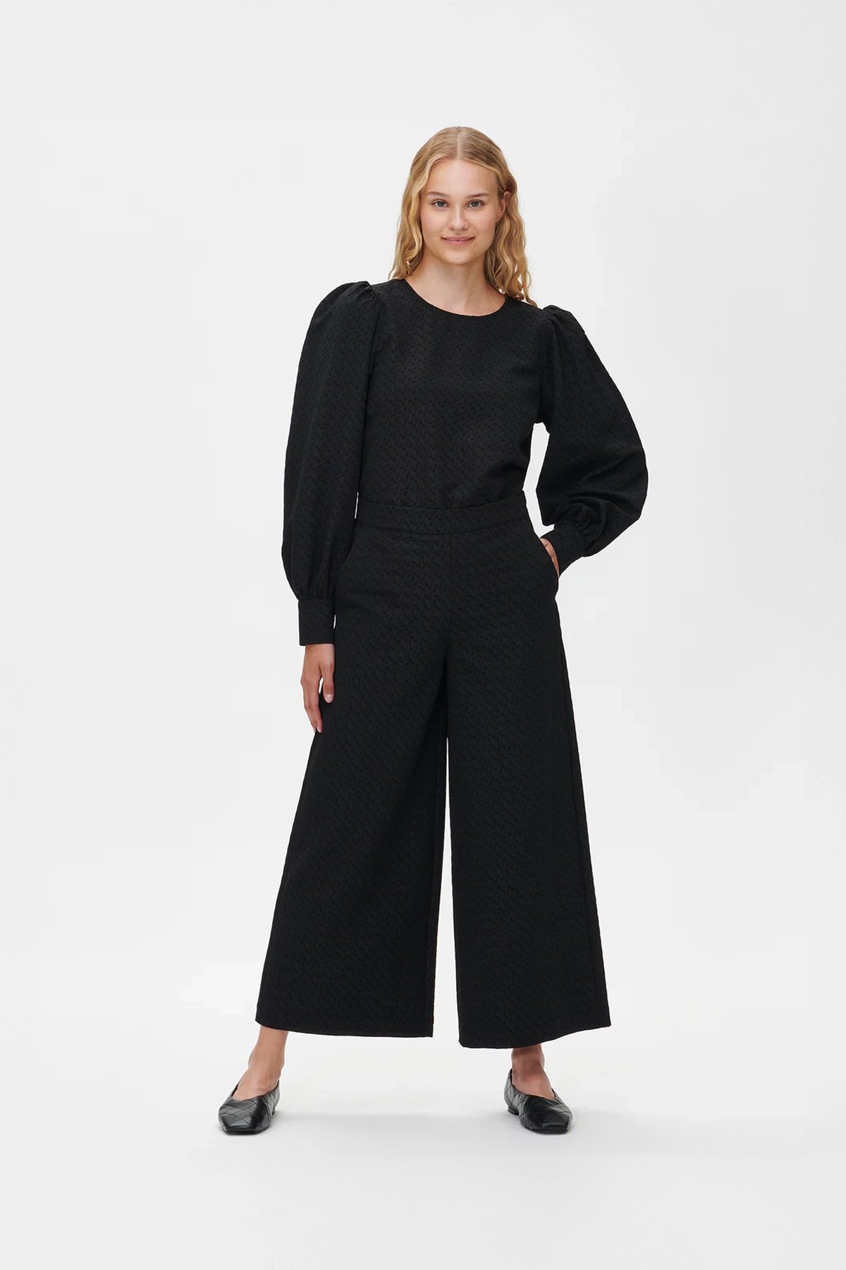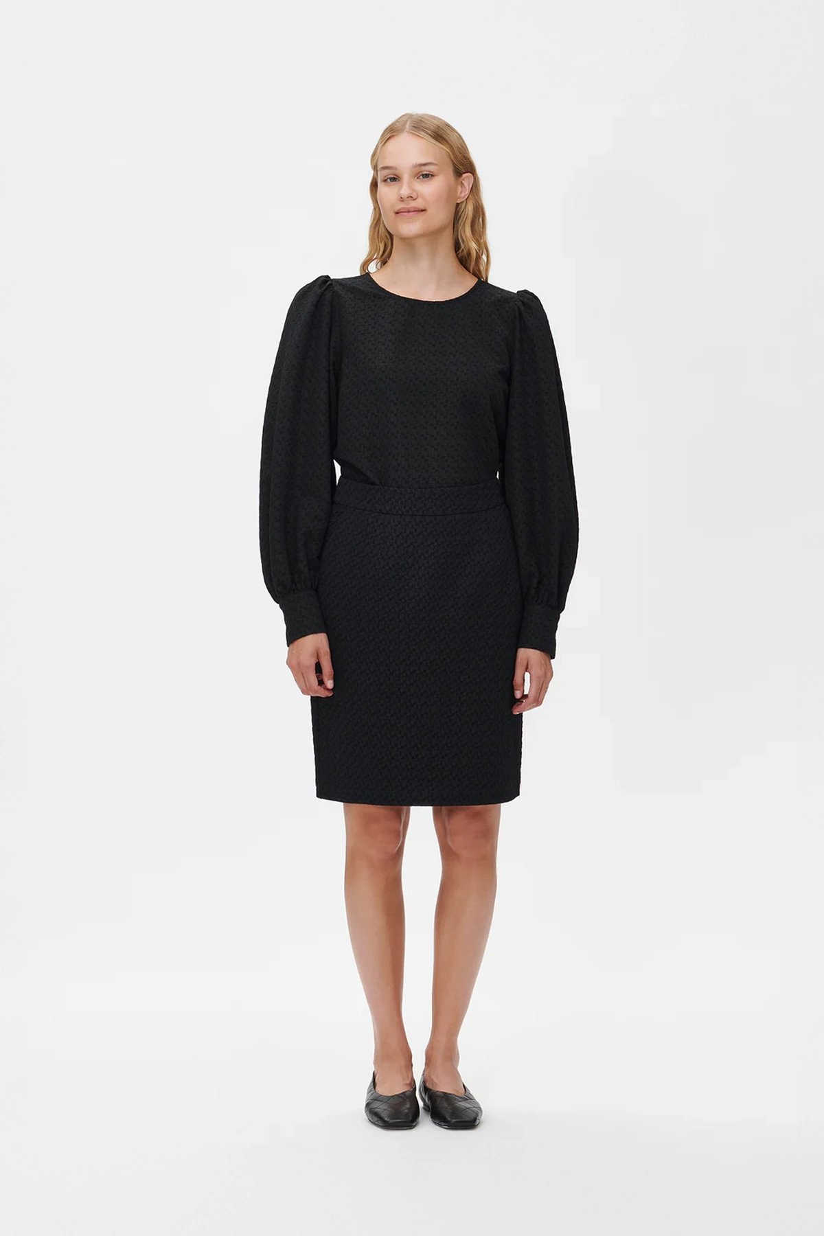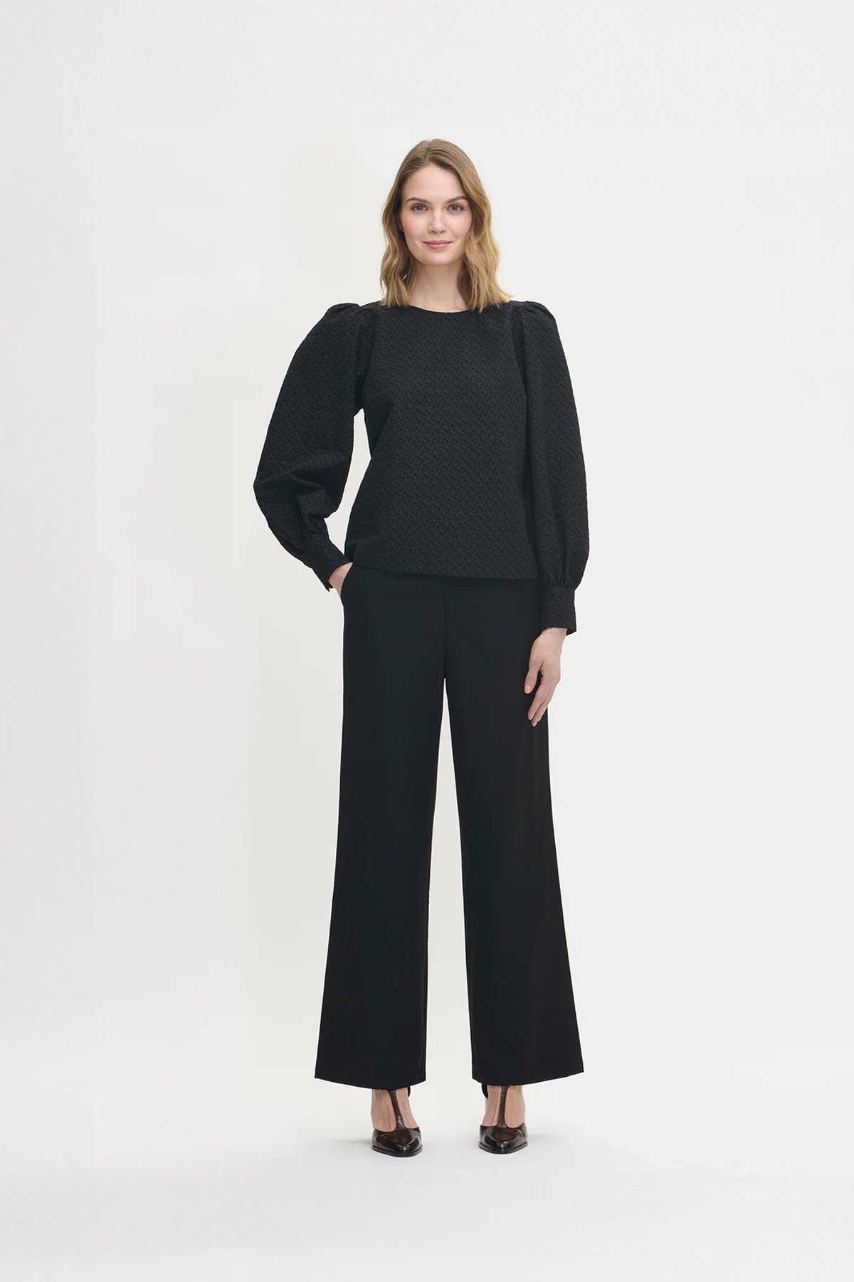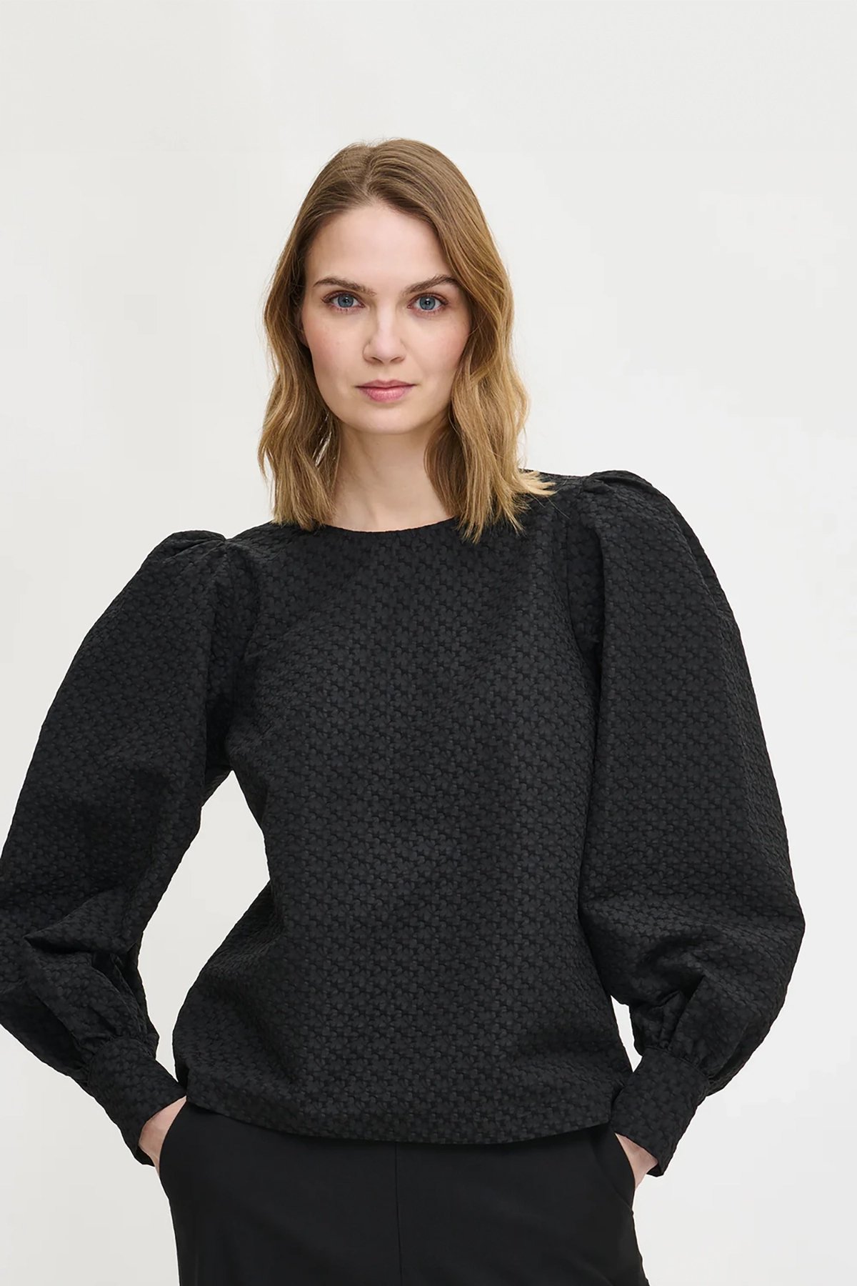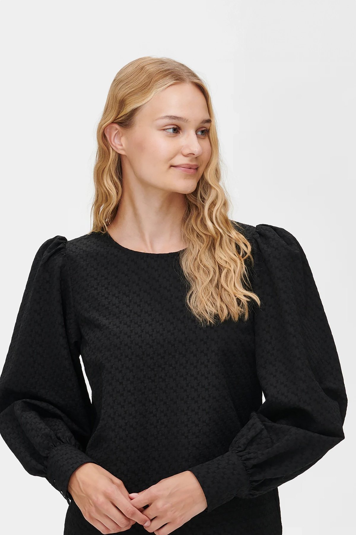 Kadın Kabartmalı Dokulu Uzun Kollu Balon Kol Bluz SİYAH - 48