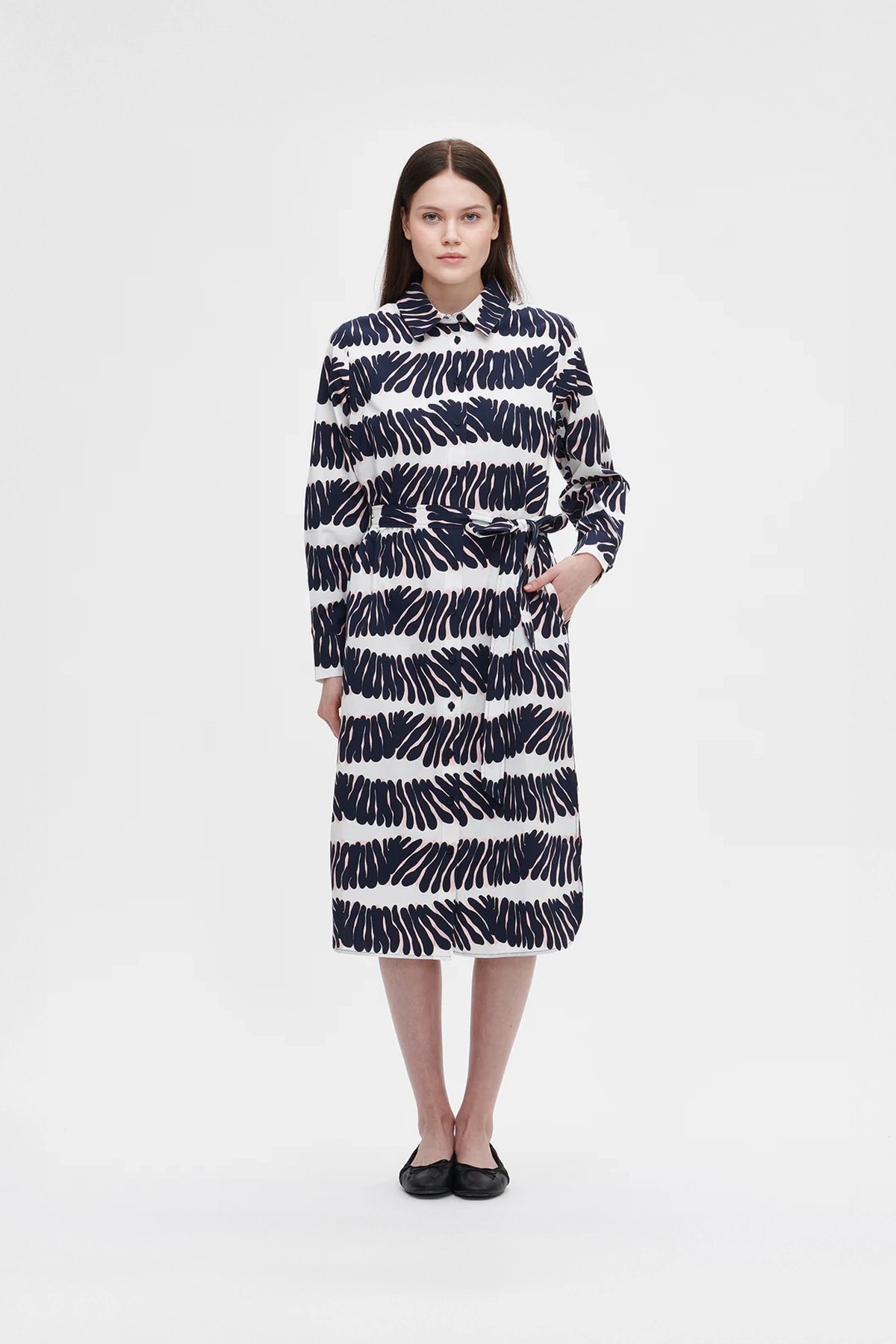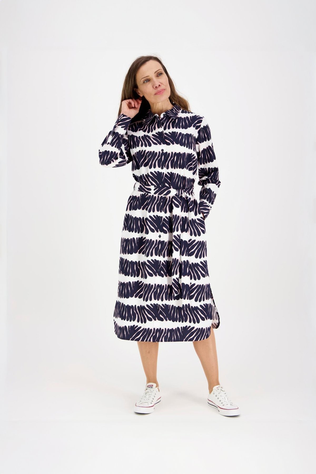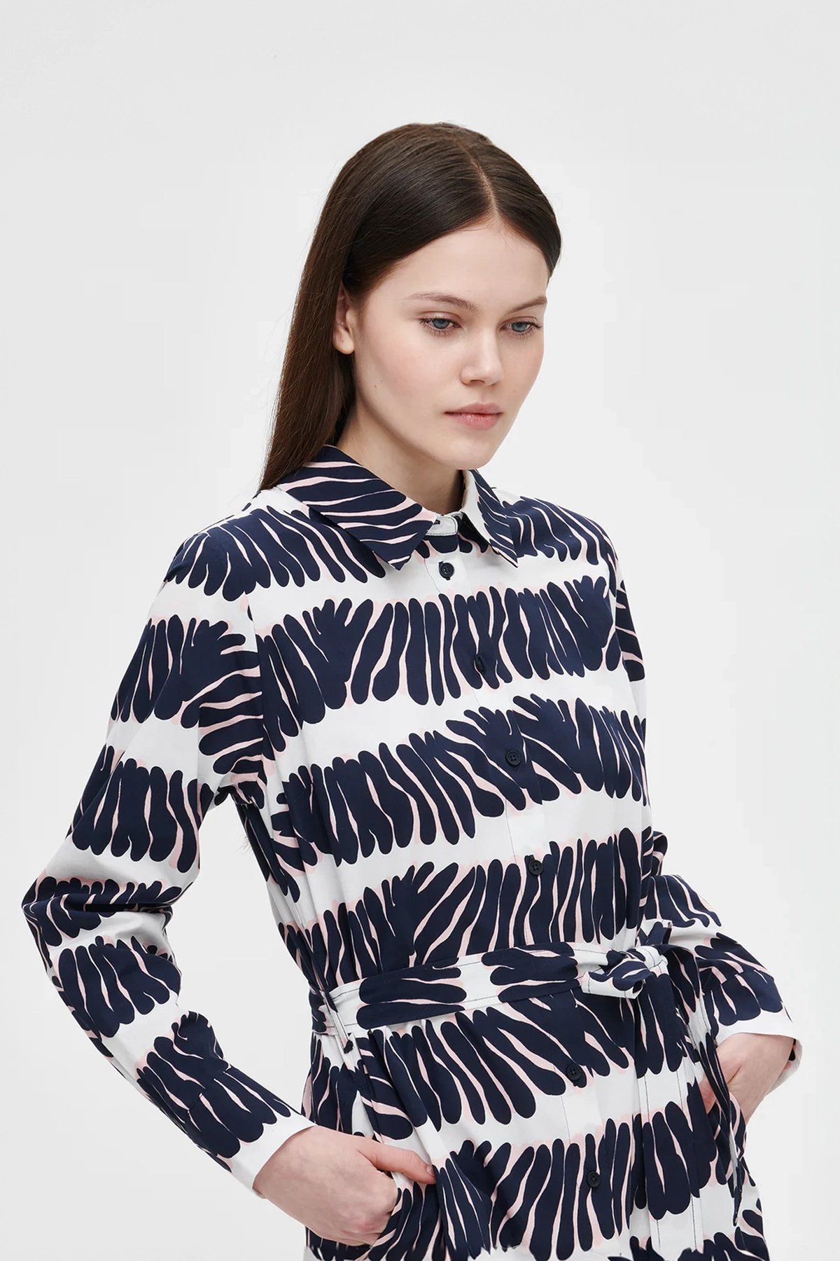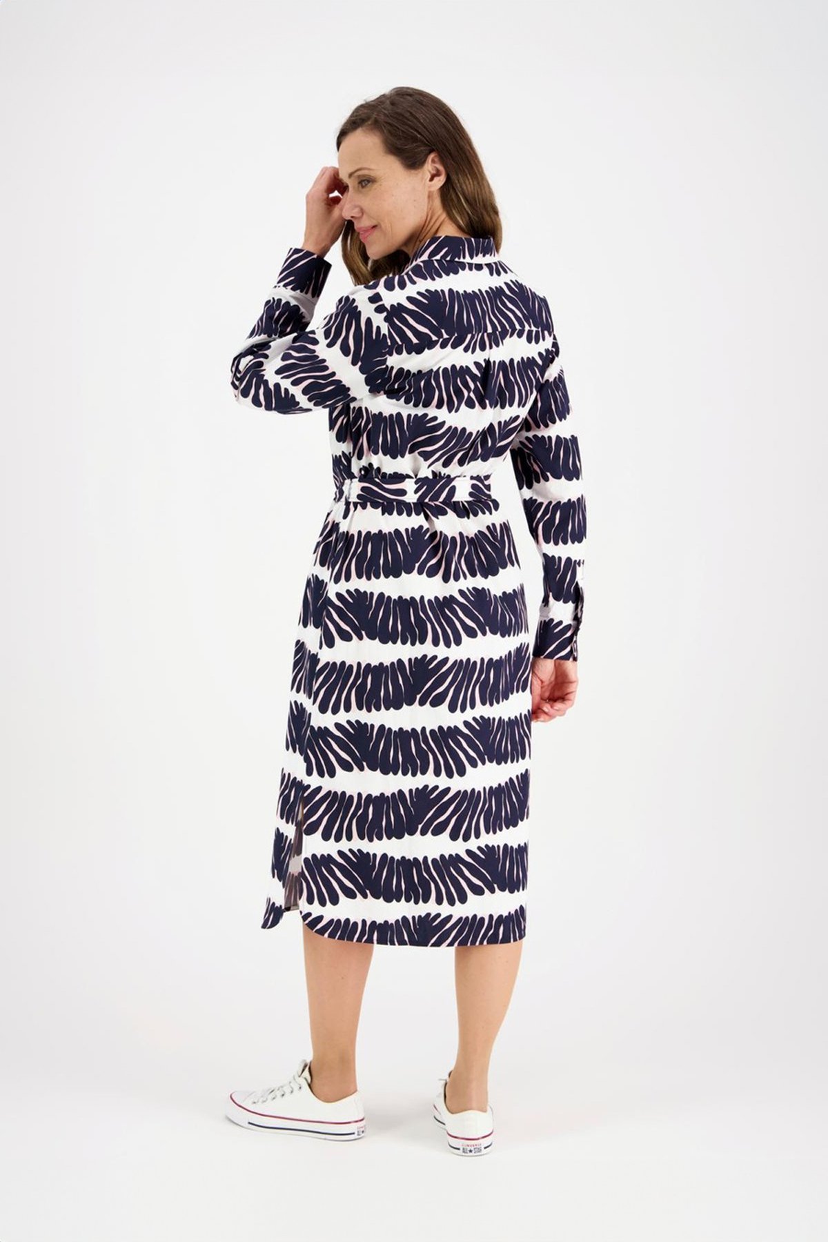 Kadın Lacivert Desenli Uzun Kollu Kuşaklı Gömlek Elbise
