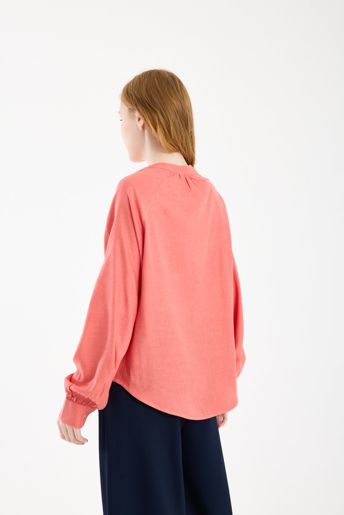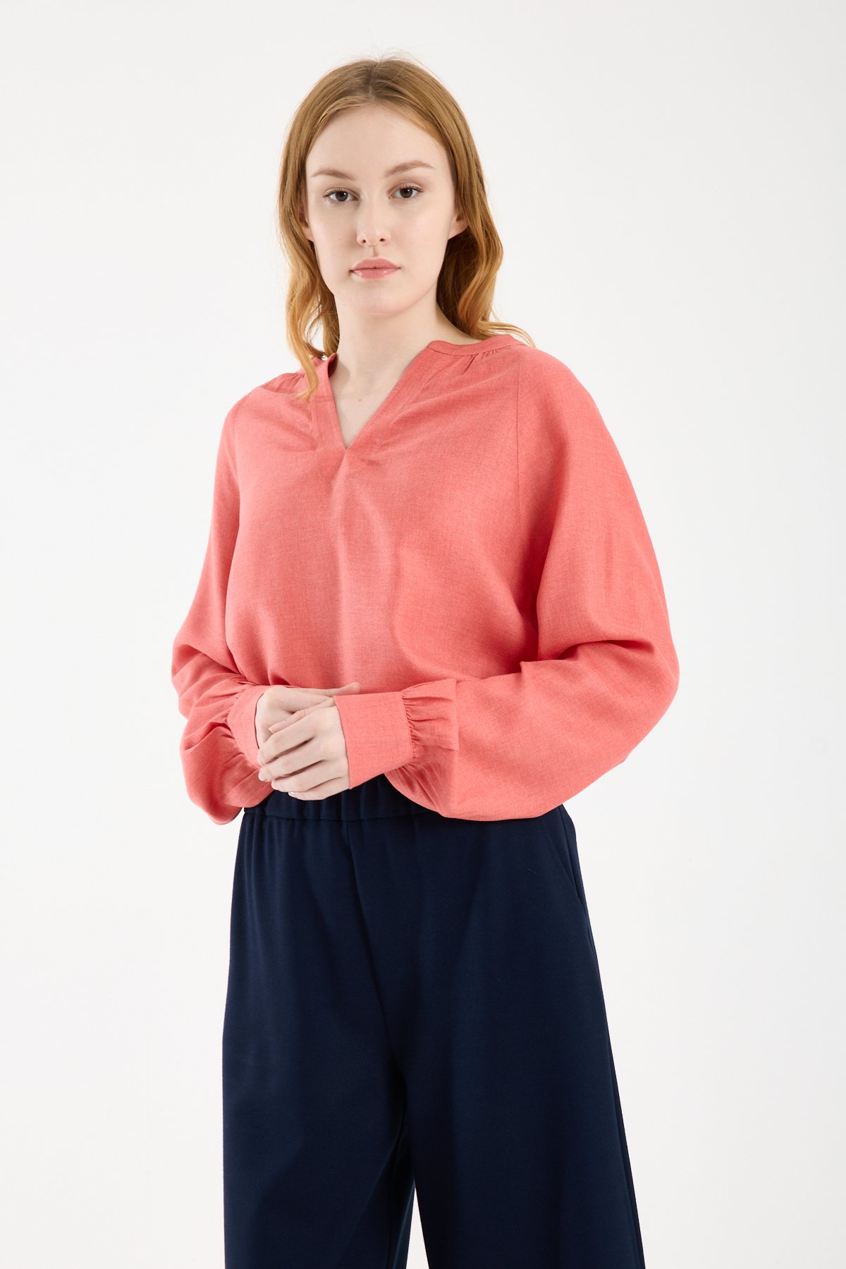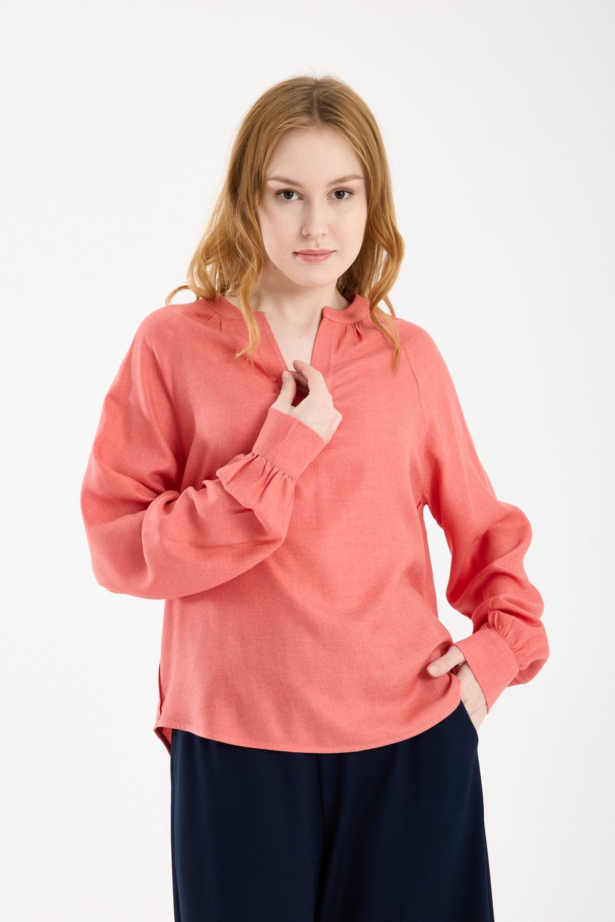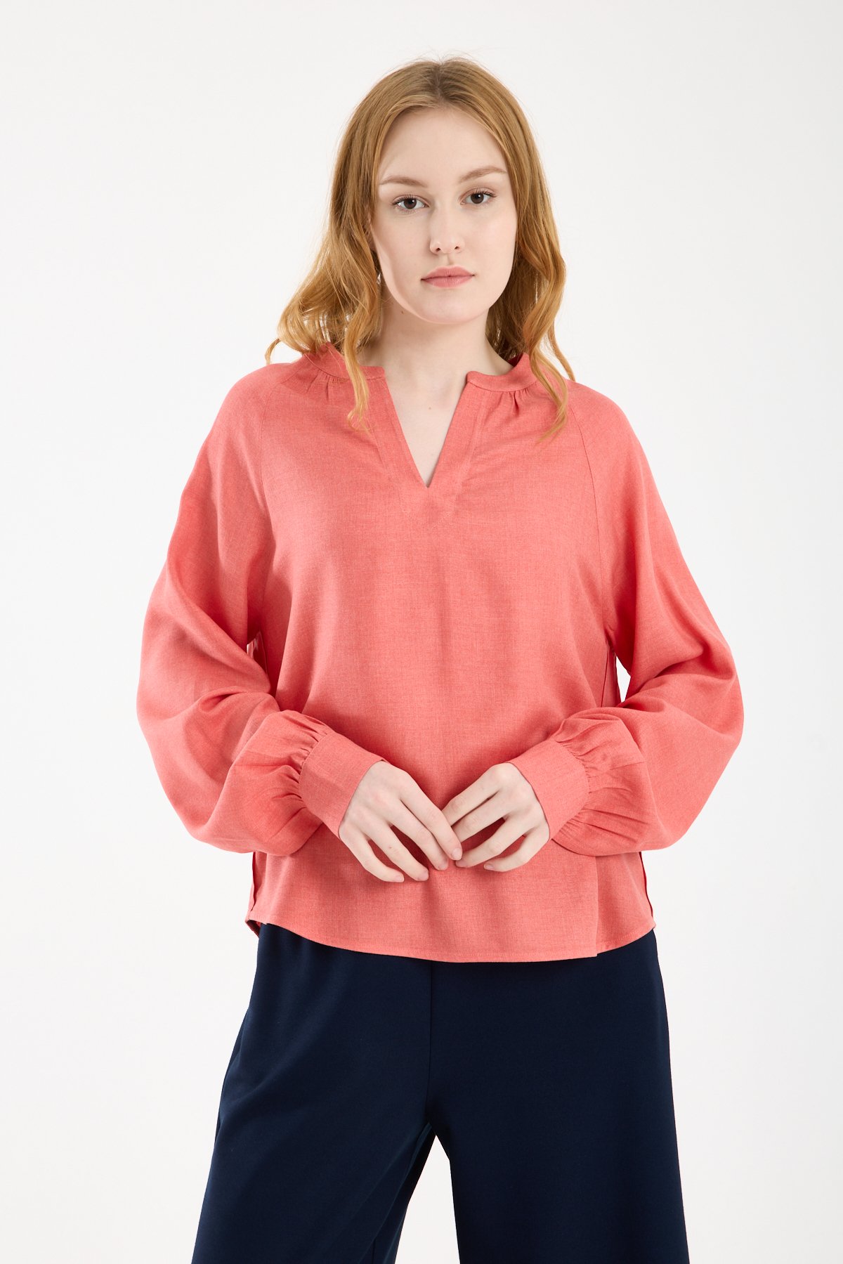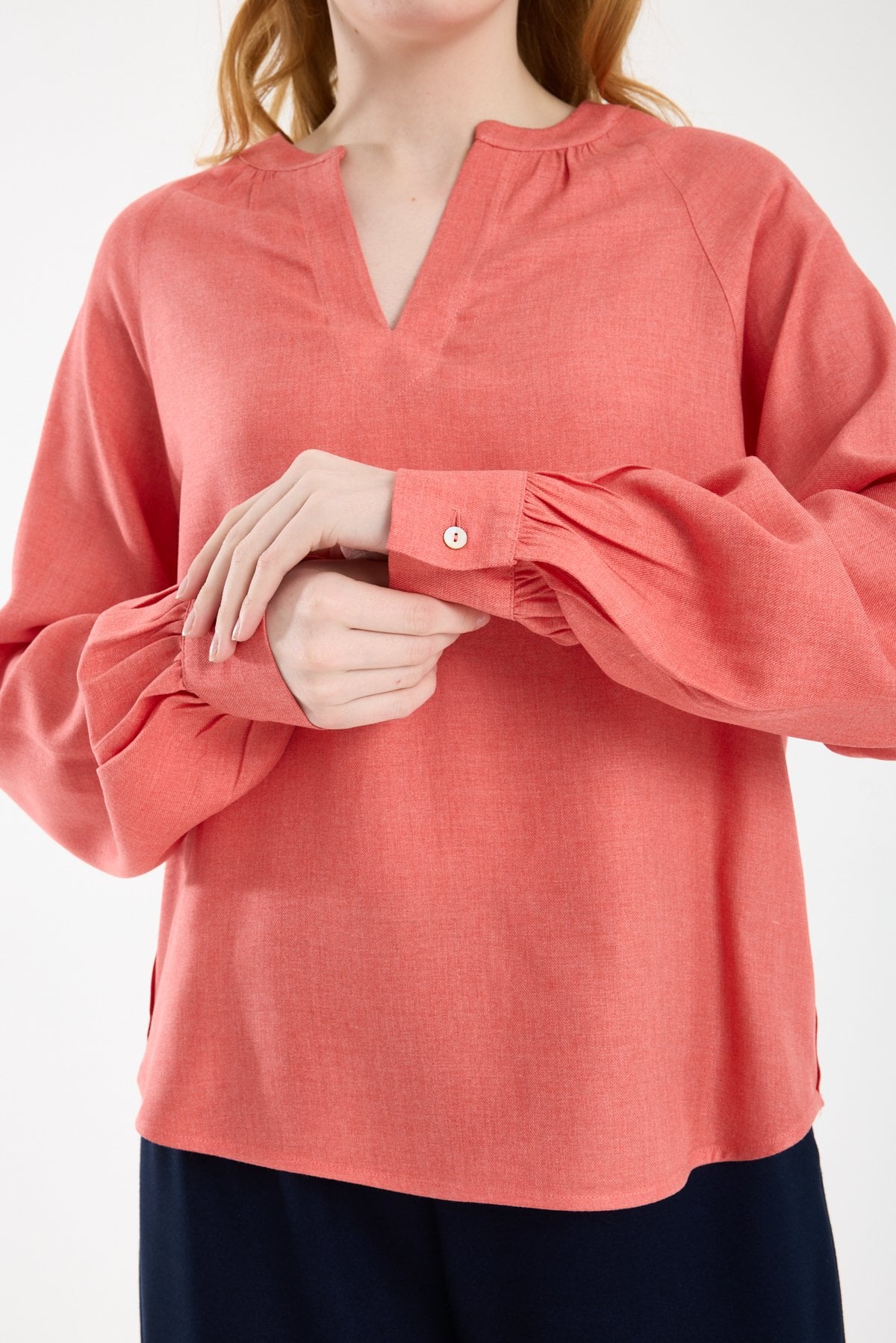 Kadın Hakim V Yaka Keten Görünümlü Uzun Kollu Manşetli Viskon Bluz NAR ÇİÇEĞİ - 44