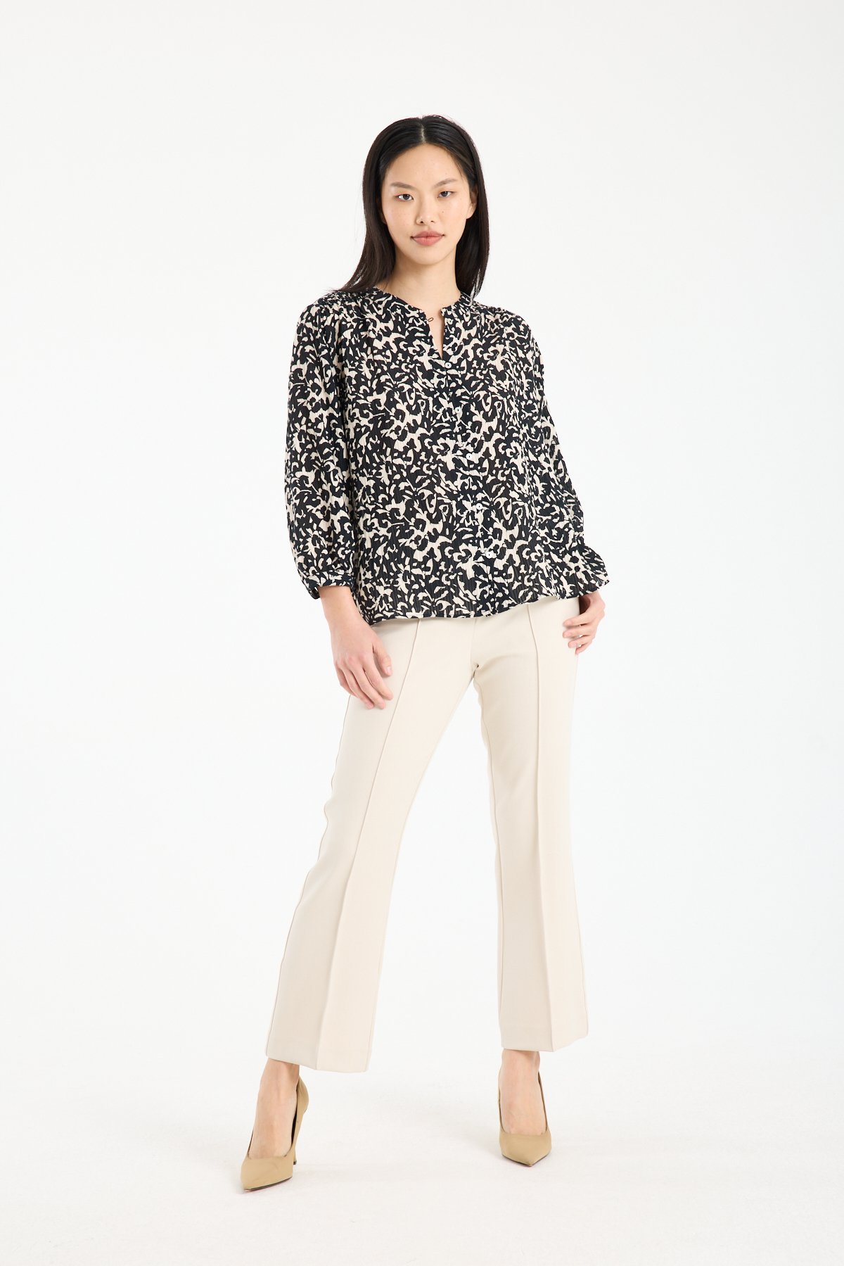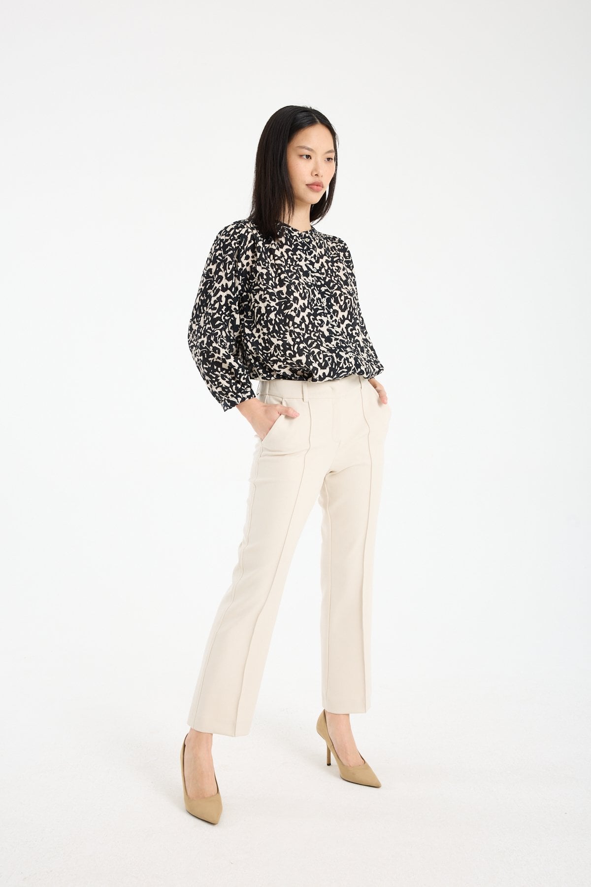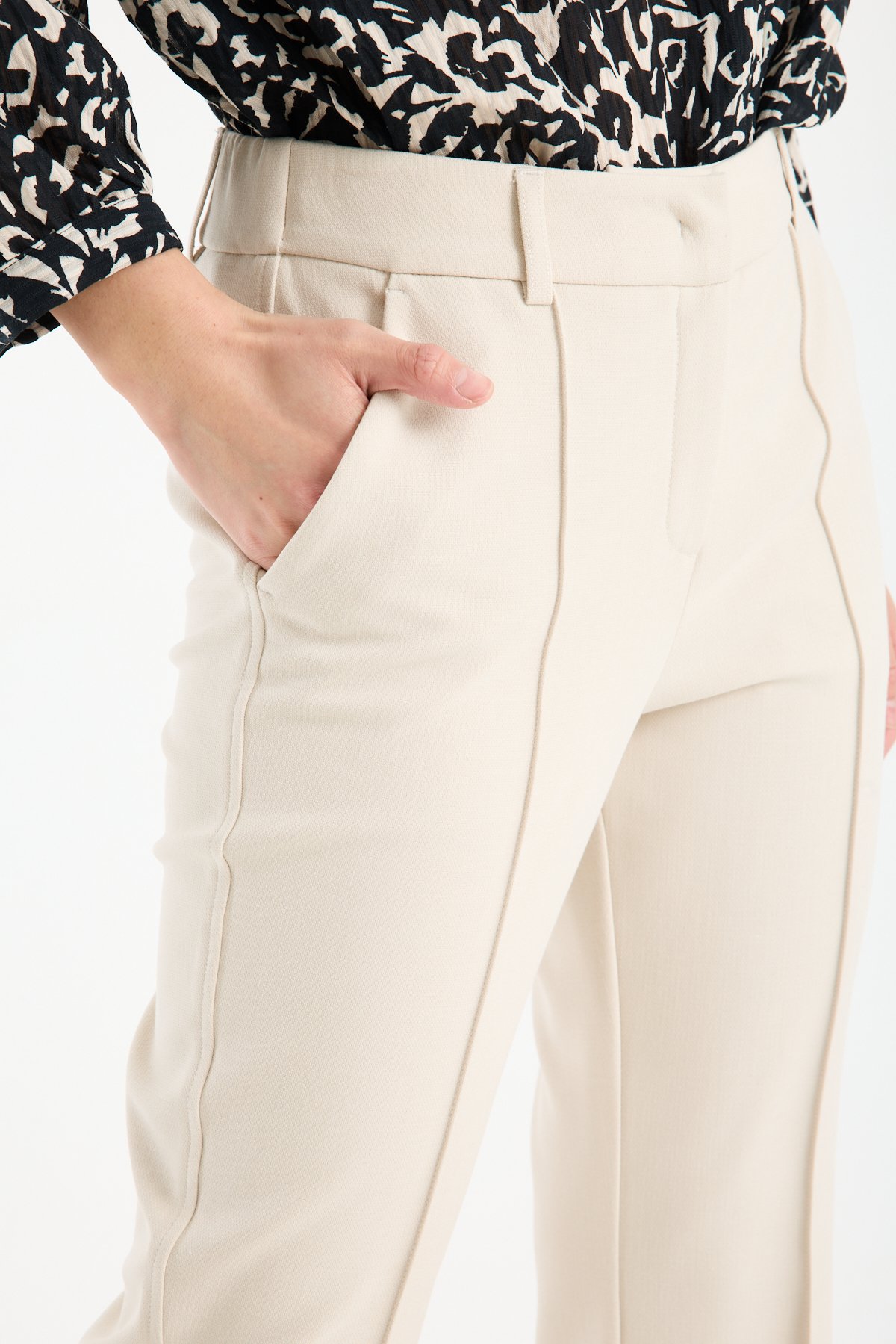 Yüksek bel tasarımı bel hattını toparlar ve dengeli bir siluet oluşturur. Ön kısımda yer alan boydan dikiş detayı, pantolona daha uzun ve düzgün bir görünüm kazandırırken ütü efektini korur. Hafif İspanyol paça kesimi sayesinde ne çok dar ne çok bol bir form sunar; hem klasik hem modern kombinlerle uyum sağlar.