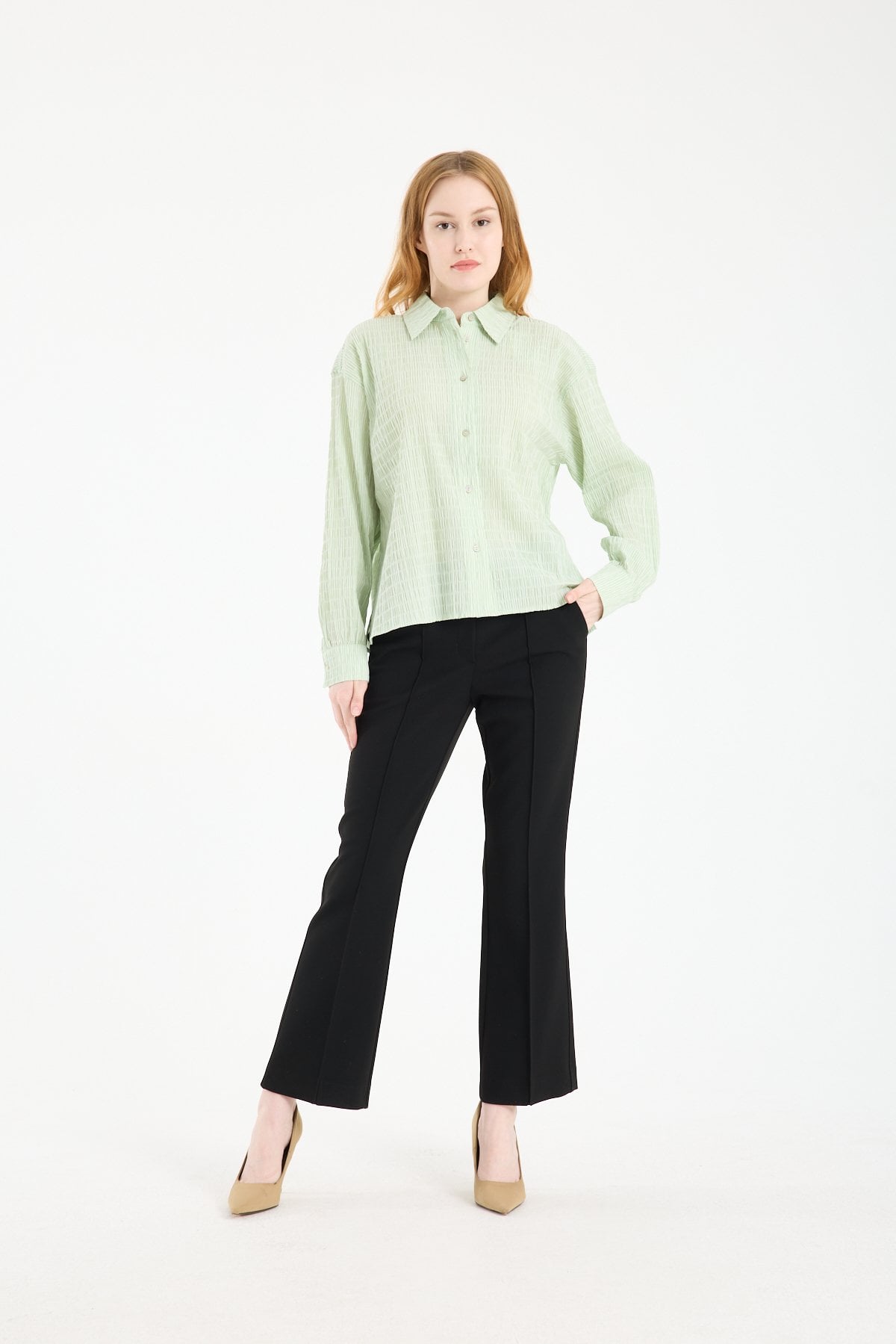 Yüksek bel tasarımı bel hattını toparlar ve dengeli bir siluet oluşturur. Ön kısımda yer alan boydan dikiş detayı, pantolona daha uzun ve düzgün bir görünüm kazandırırken ütü efektini korur. Hafif İspanyol paça kesimi sayesinde ne çok dar ne çok bol bir form sunar; hem klasik hem modern kombinlerle uyum sağlar.