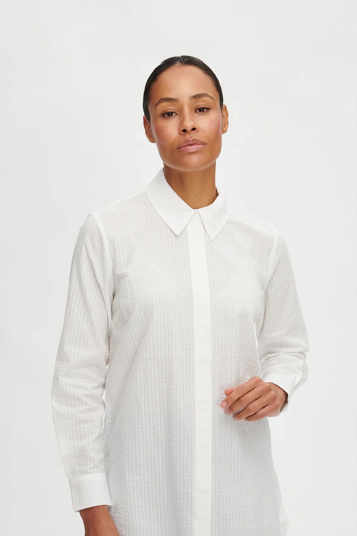 Uzun Kollu Çizgili Dokulu Uzun Boy Kadın Gömlek Tunik EKRU - 48